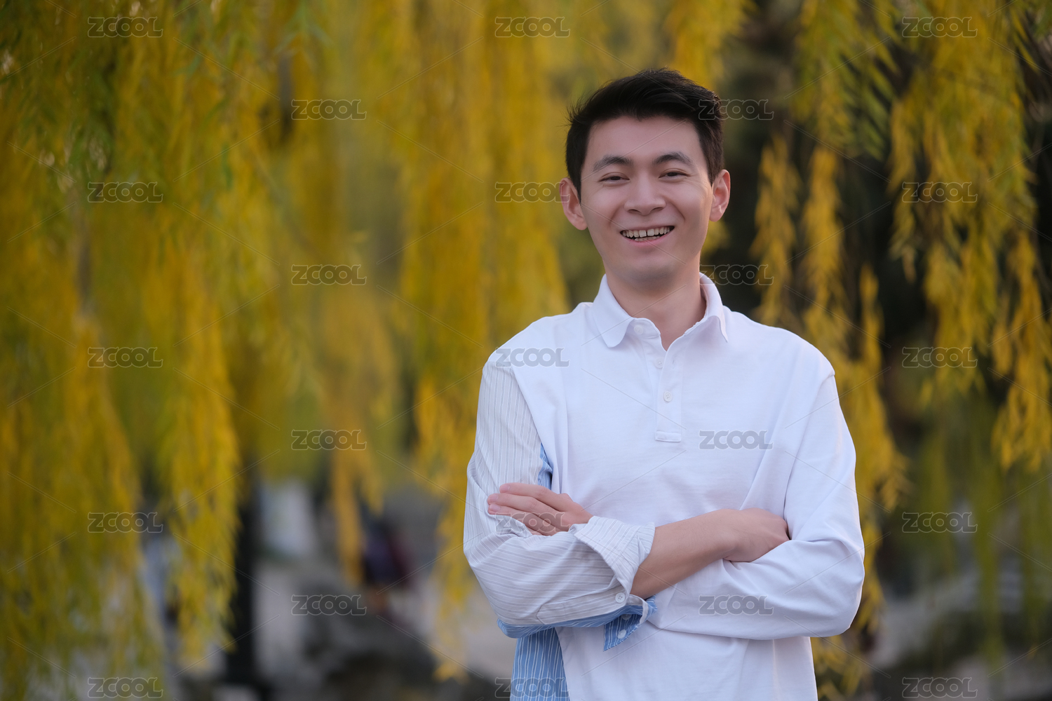 年轻的中国帅哥在金黄色的柳树前看镜头笑