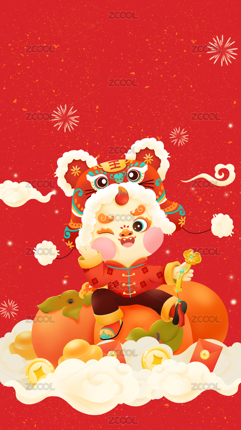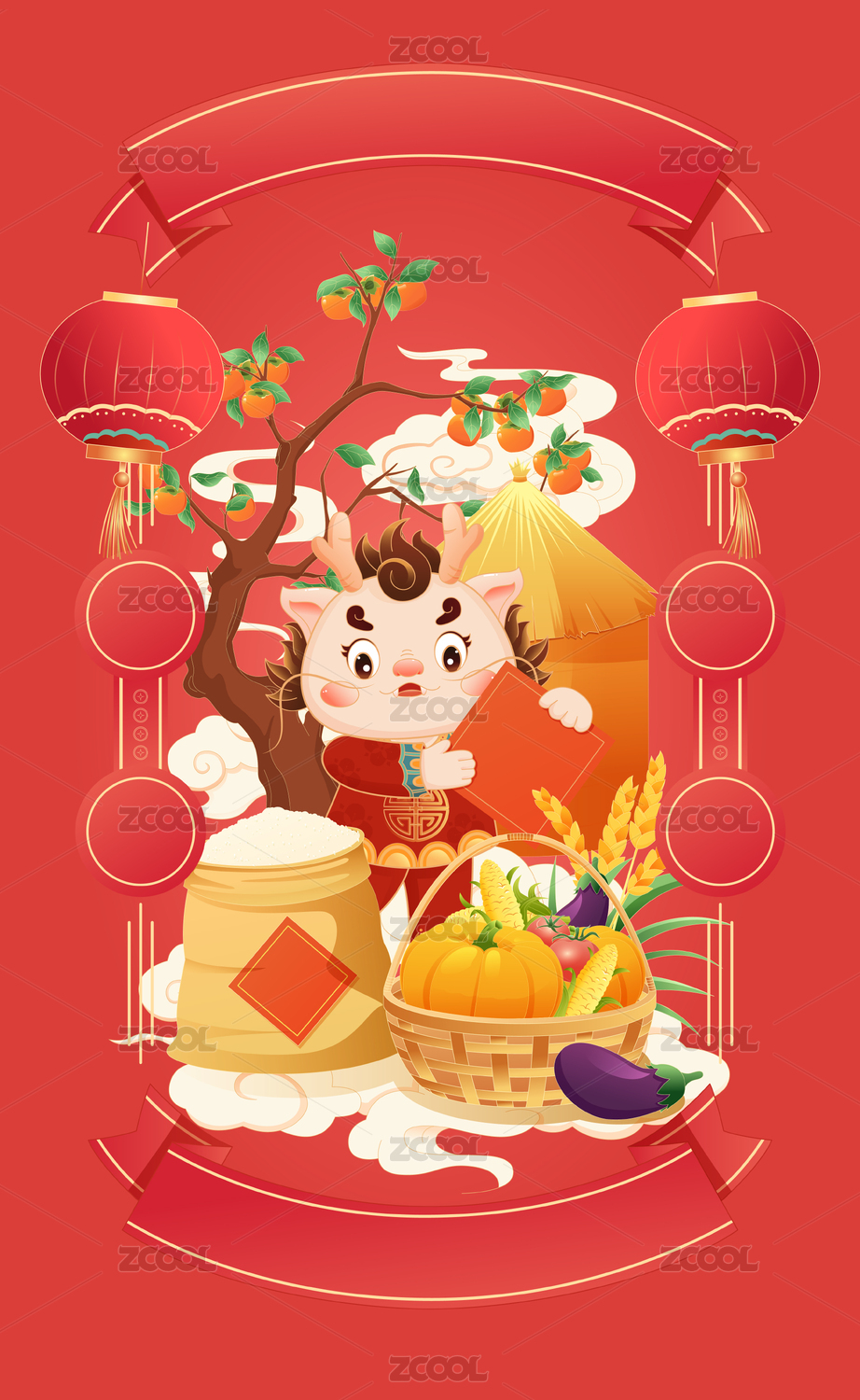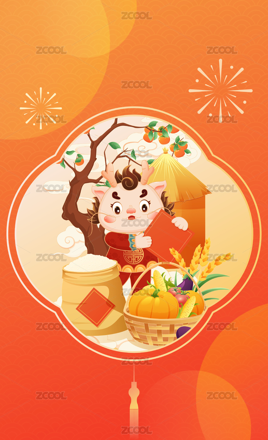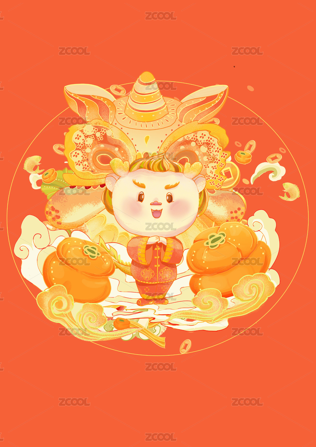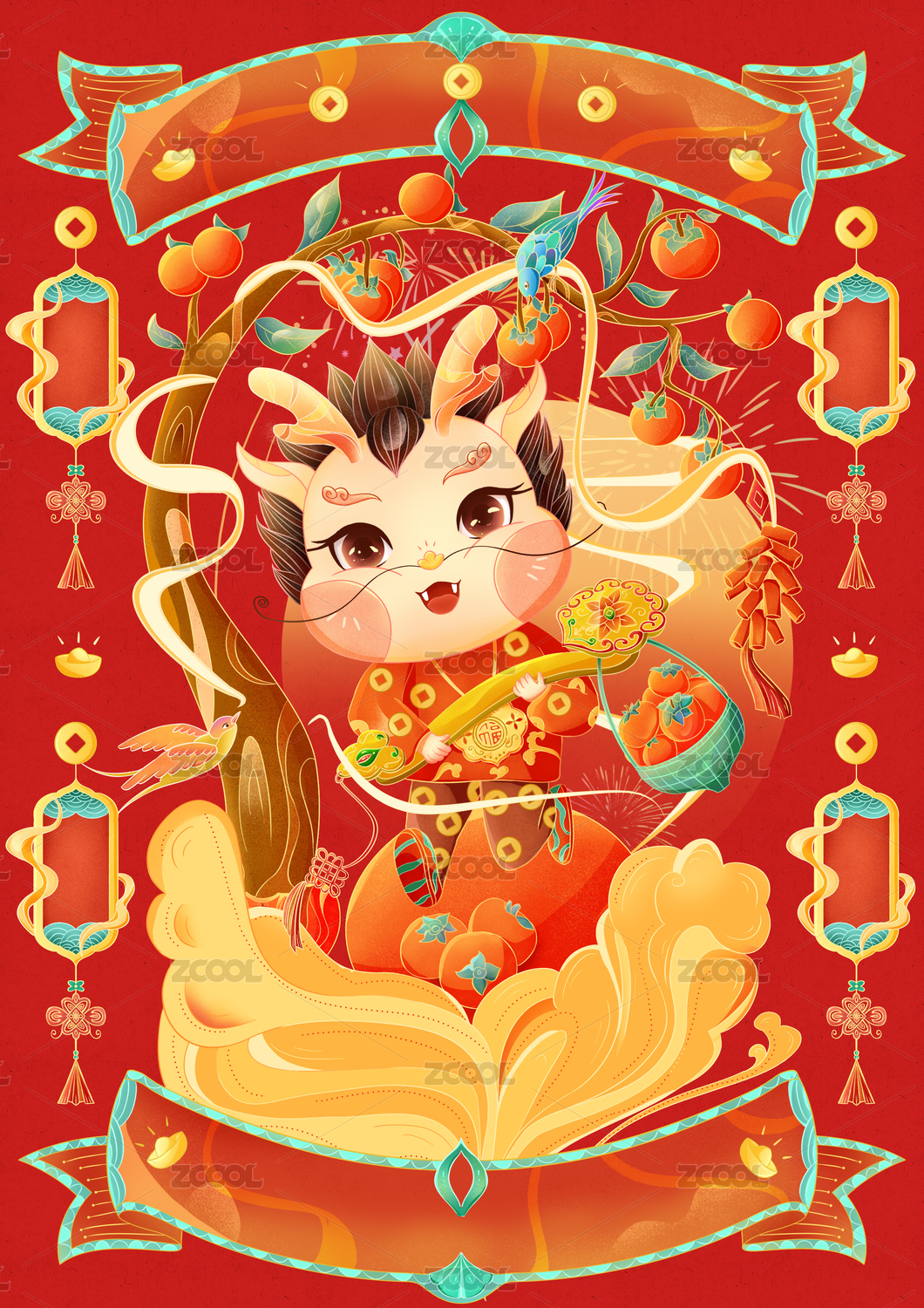 吉祥物龙坐在柿子上春节创意插画主题海报