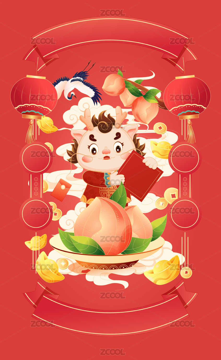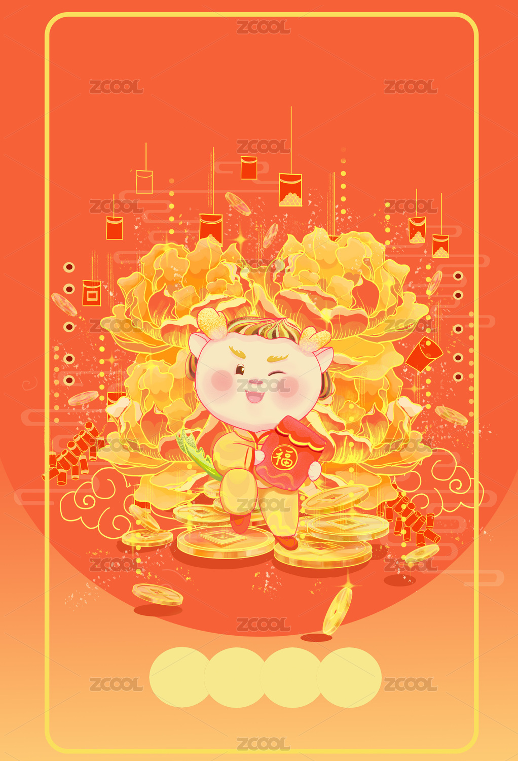 龙年,红色,喜庆,十二生肖,龙,年画,贺图,金币,财宝,好运