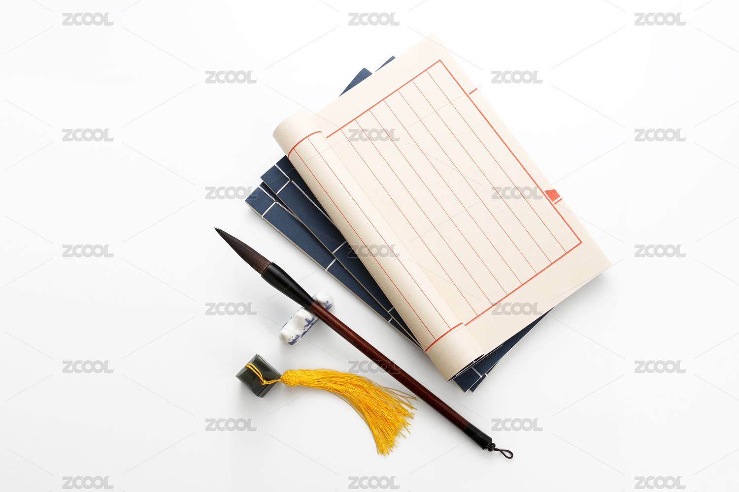 传统方法装裱的册页摆放在桌面上旁边放有文房四宝