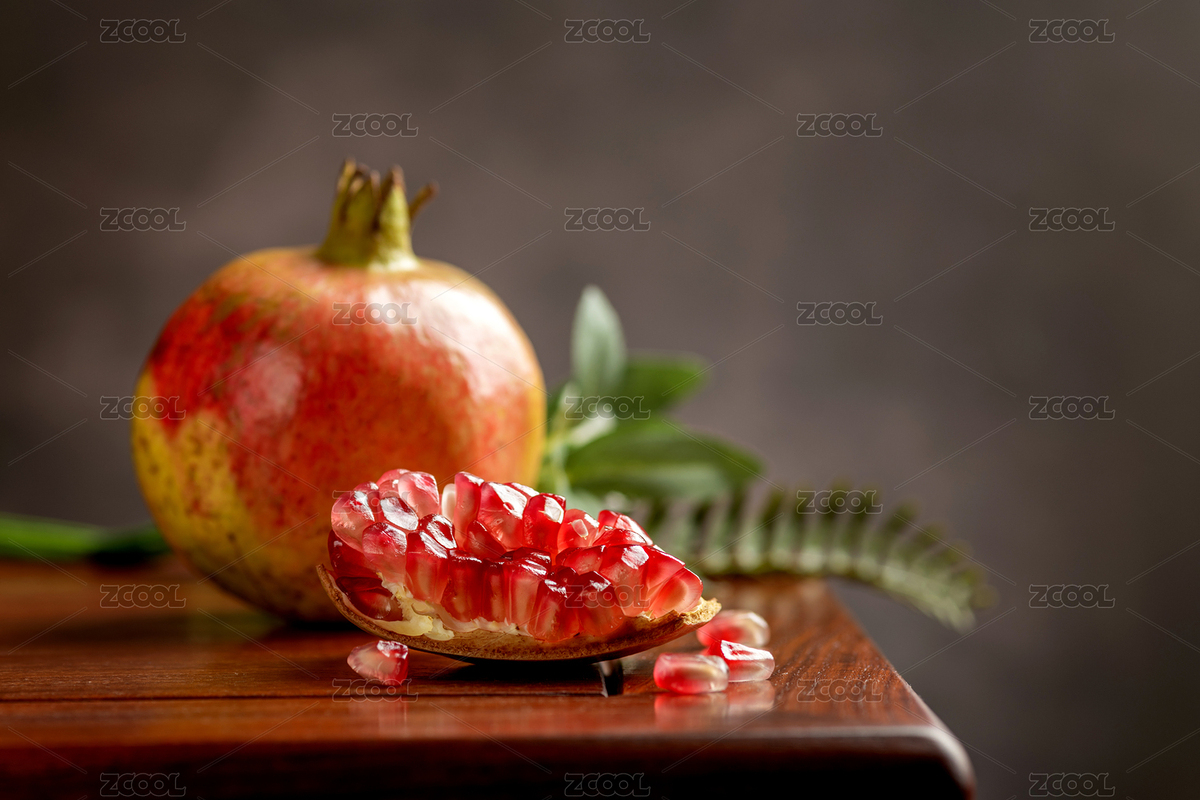 石榴和切开的石榴摆放在中式桌面上