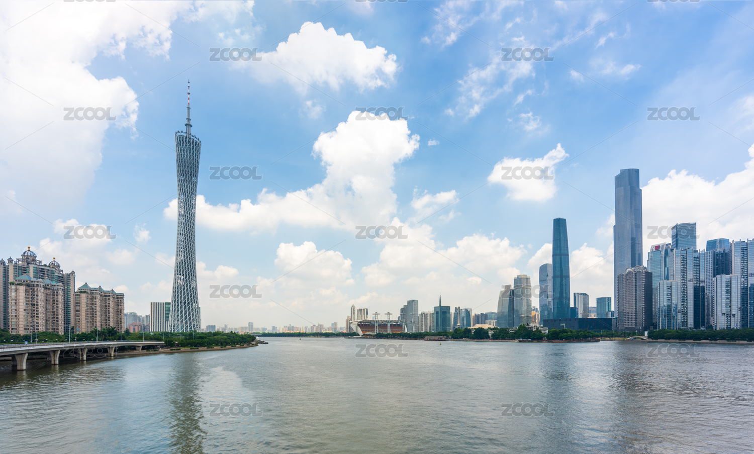 蓝天白云下广州珠江河畔城市中心建筑天际线