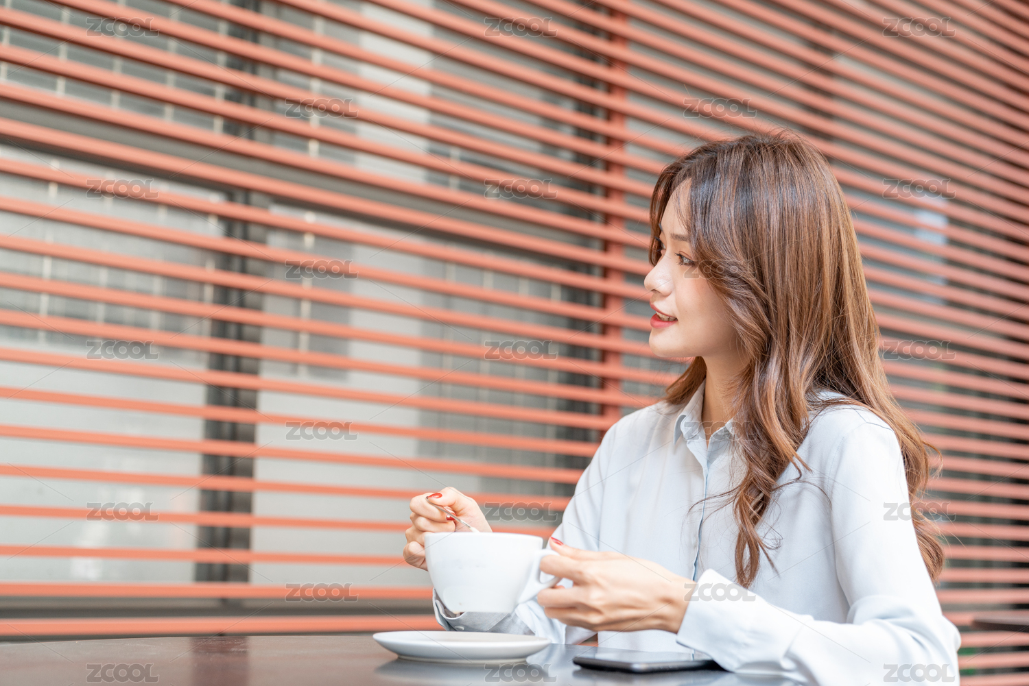 一个中国年轻职业女性独自坐着喝咖啡