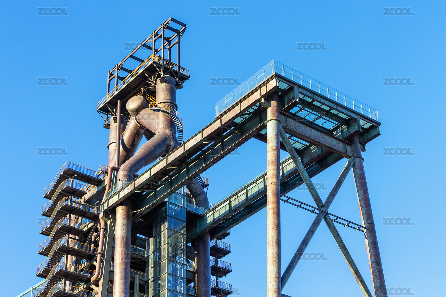 蓝天下的中国北京首钢遗址工业公园中废弃的工业设备