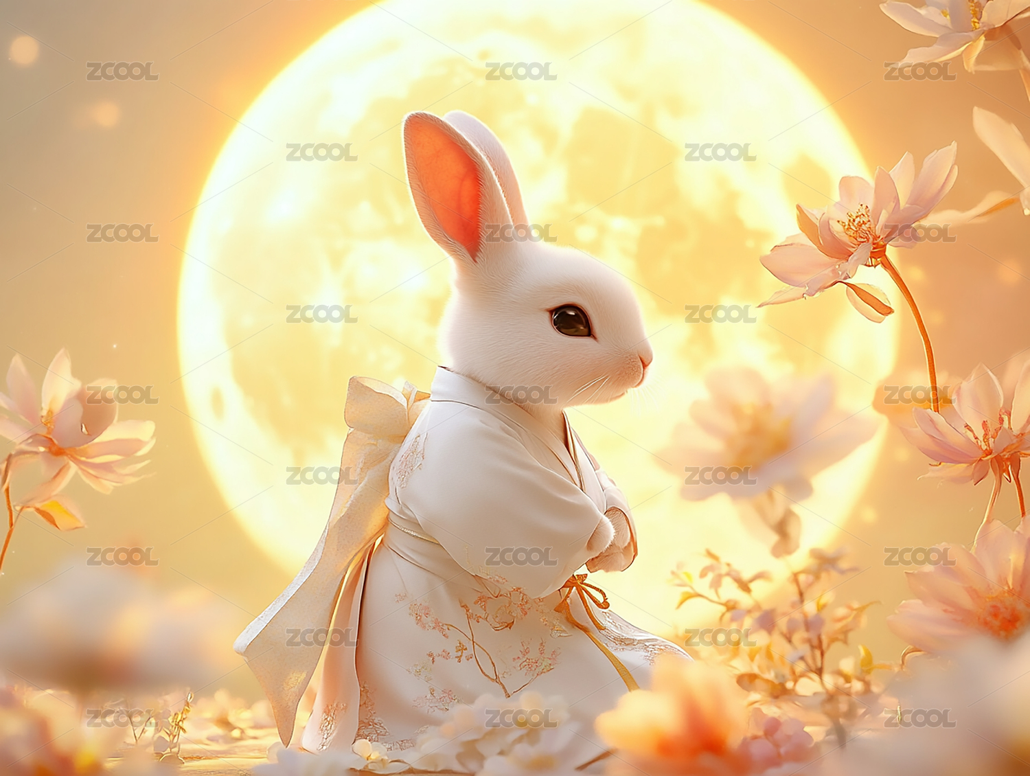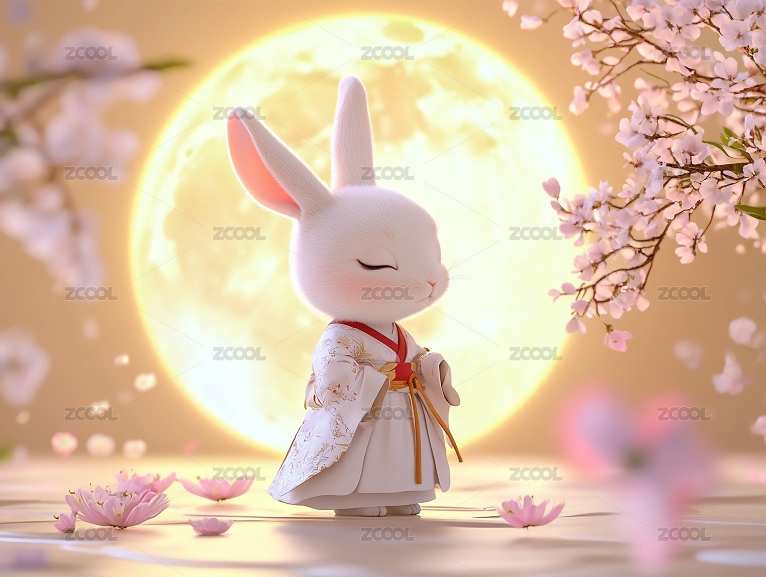 兔子,月兔,樱花,亮月,圆月,和服,花瓣,花枝,呆萌,娇柔