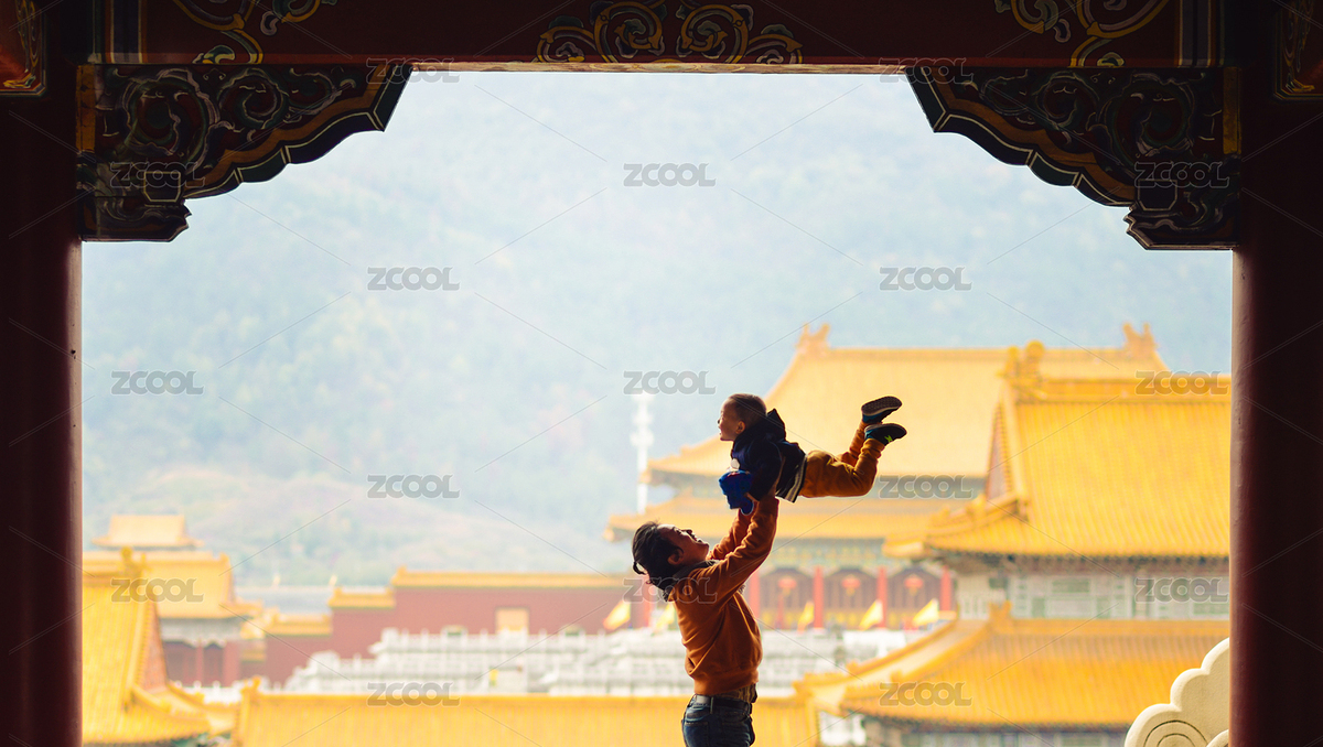 父子在横店影视城的明清宫苑的紫禁城举高高