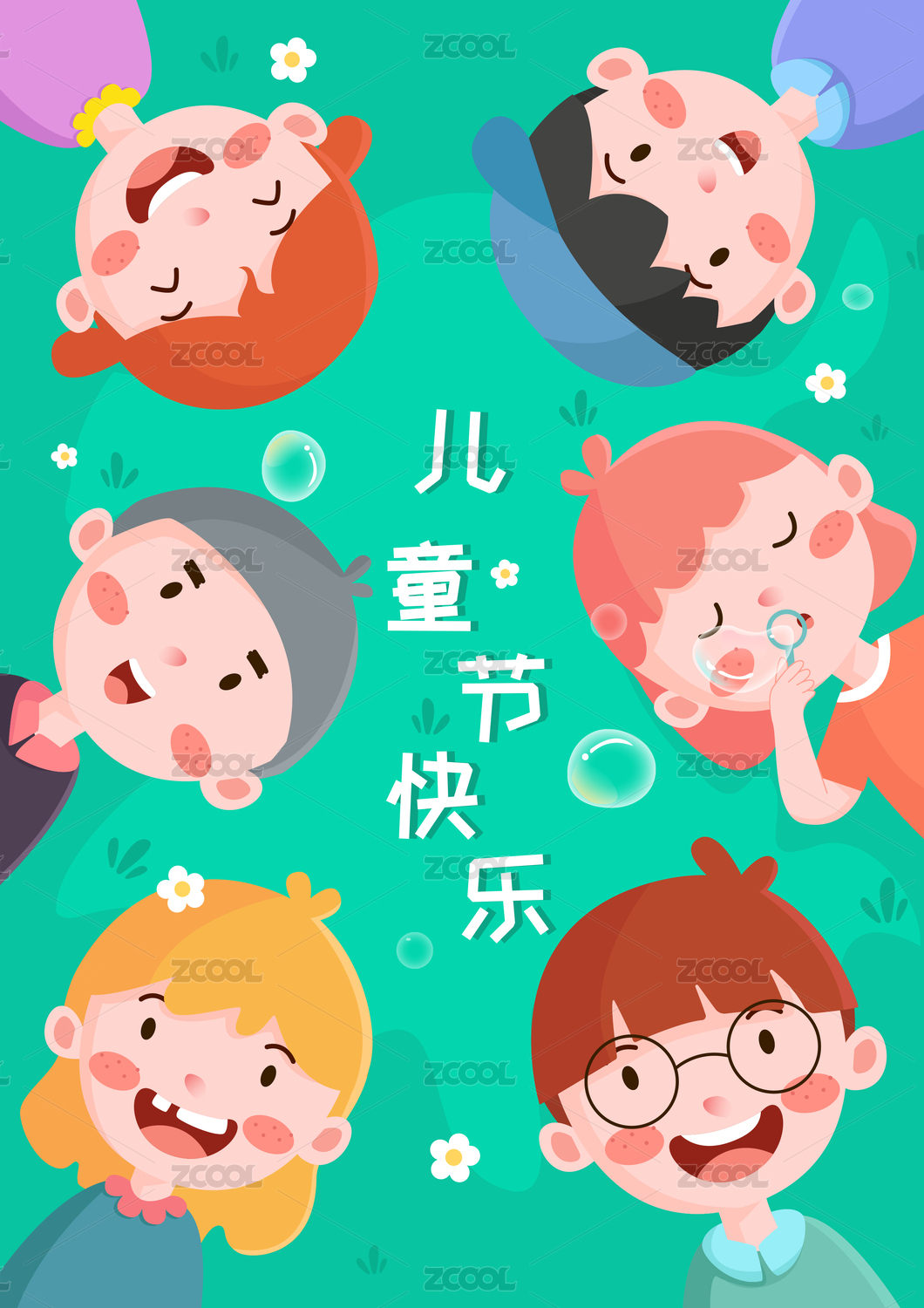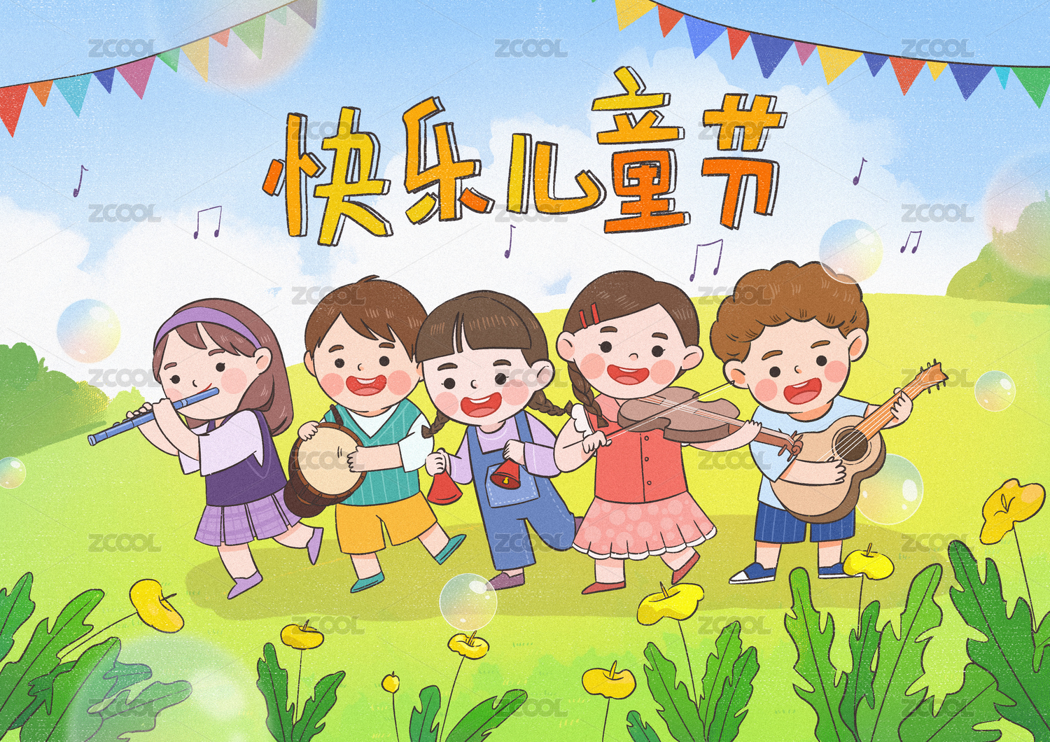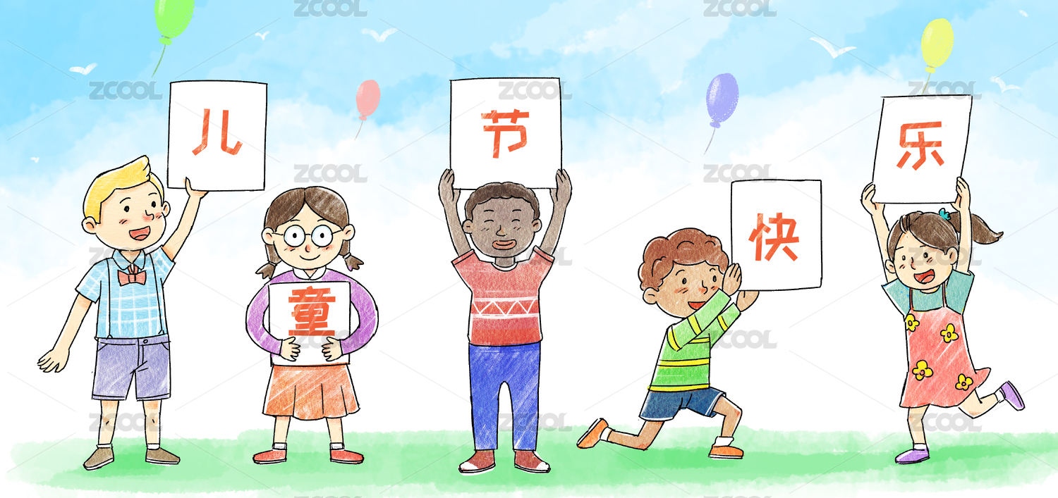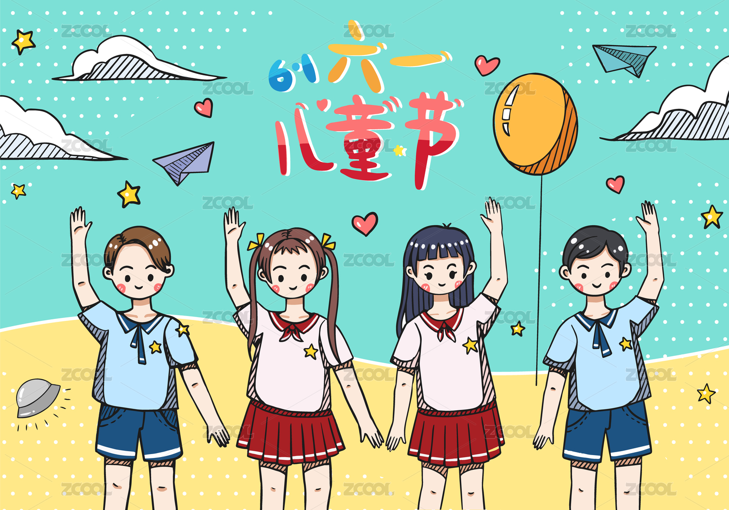 矢量插画四个小朋友站一起庆祝六一儿童节