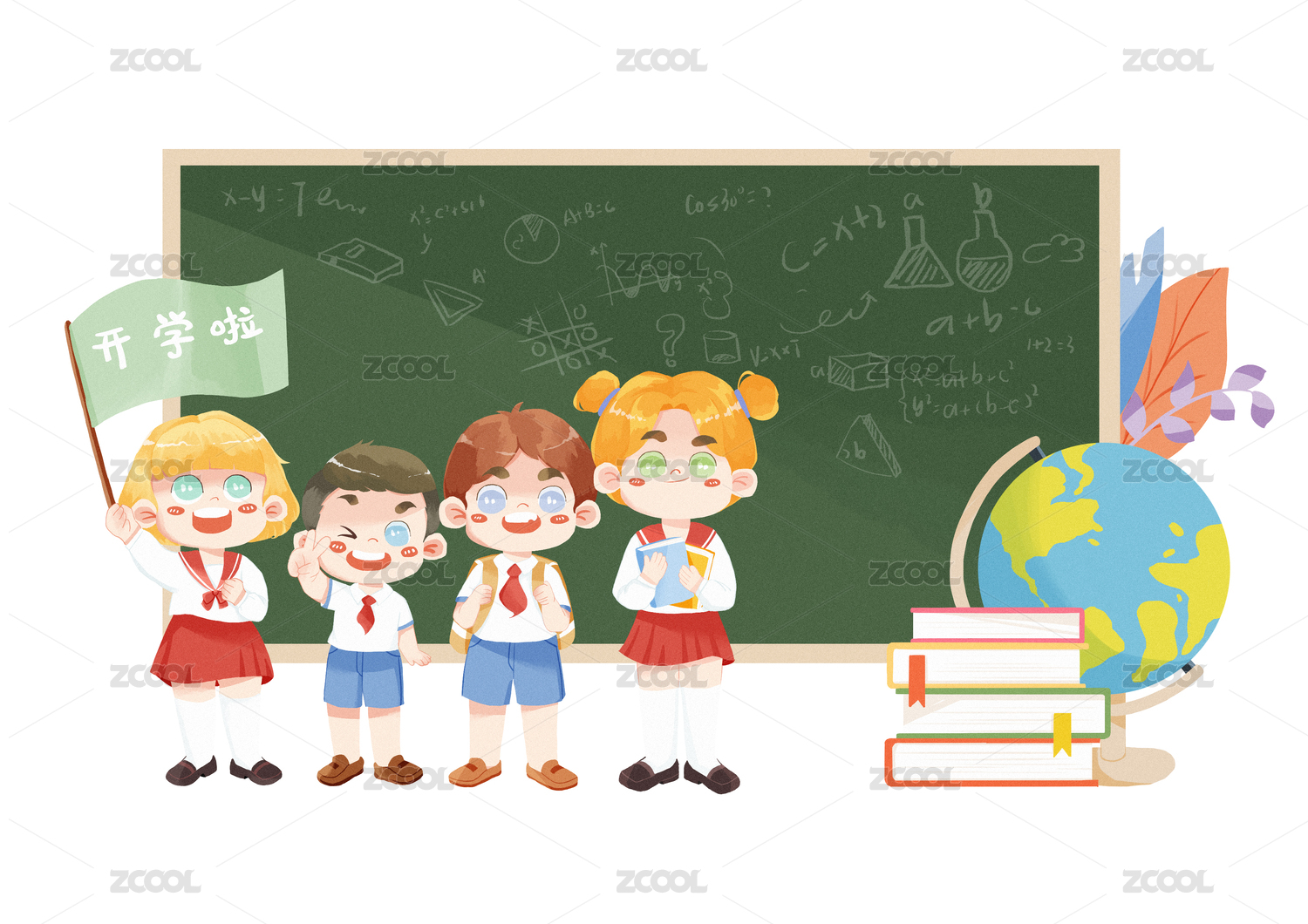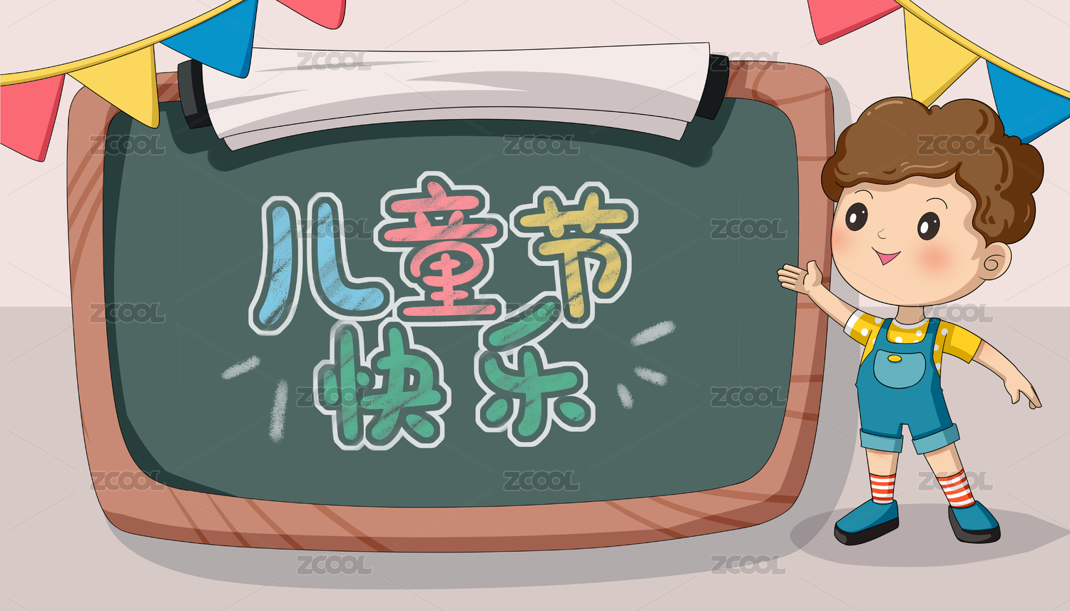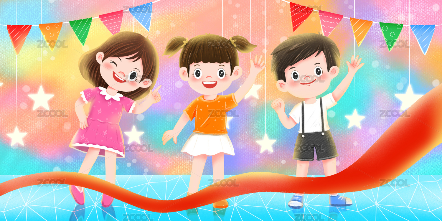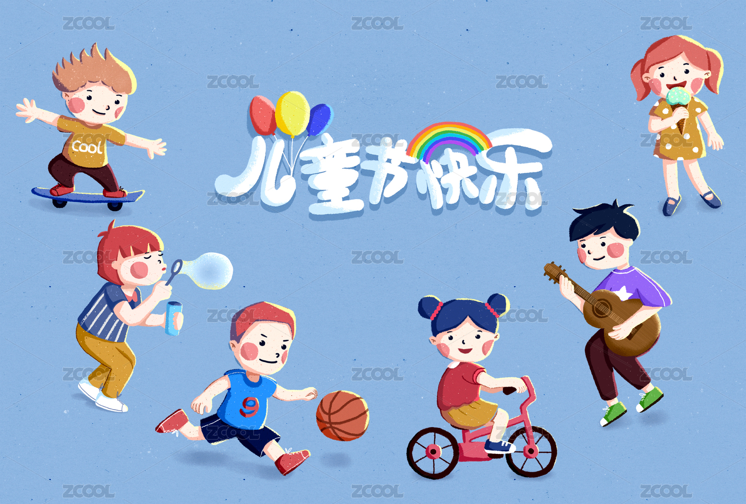 矢量插画四个小朋友站一起庆祝六一儿童节