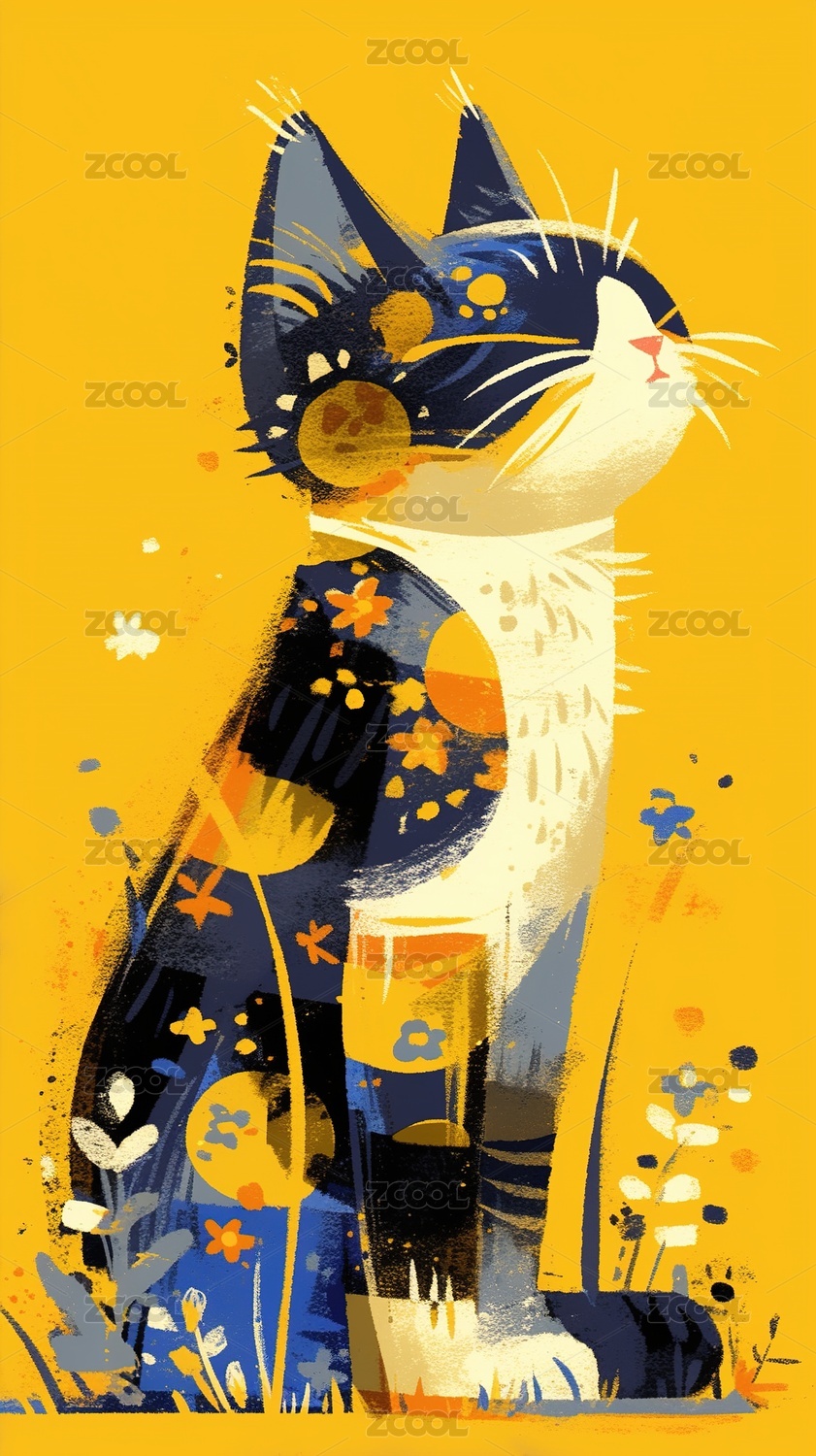 扁平小猫插画明亮一只可爱宠物猫绘画