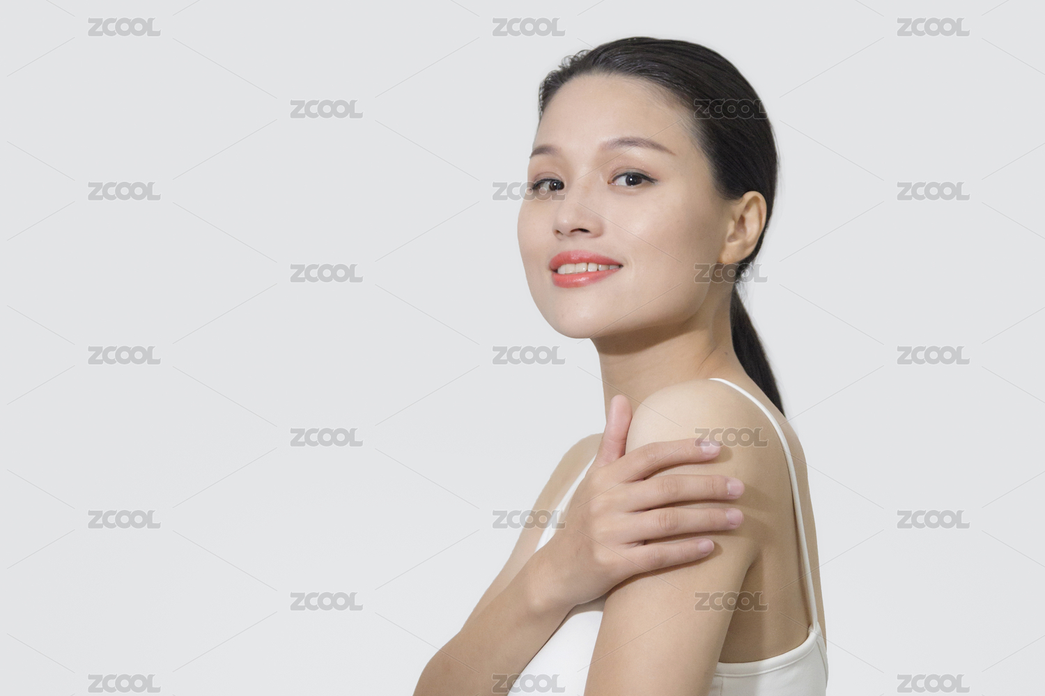 东方女性手放在肩膀上微笑看着镜头
