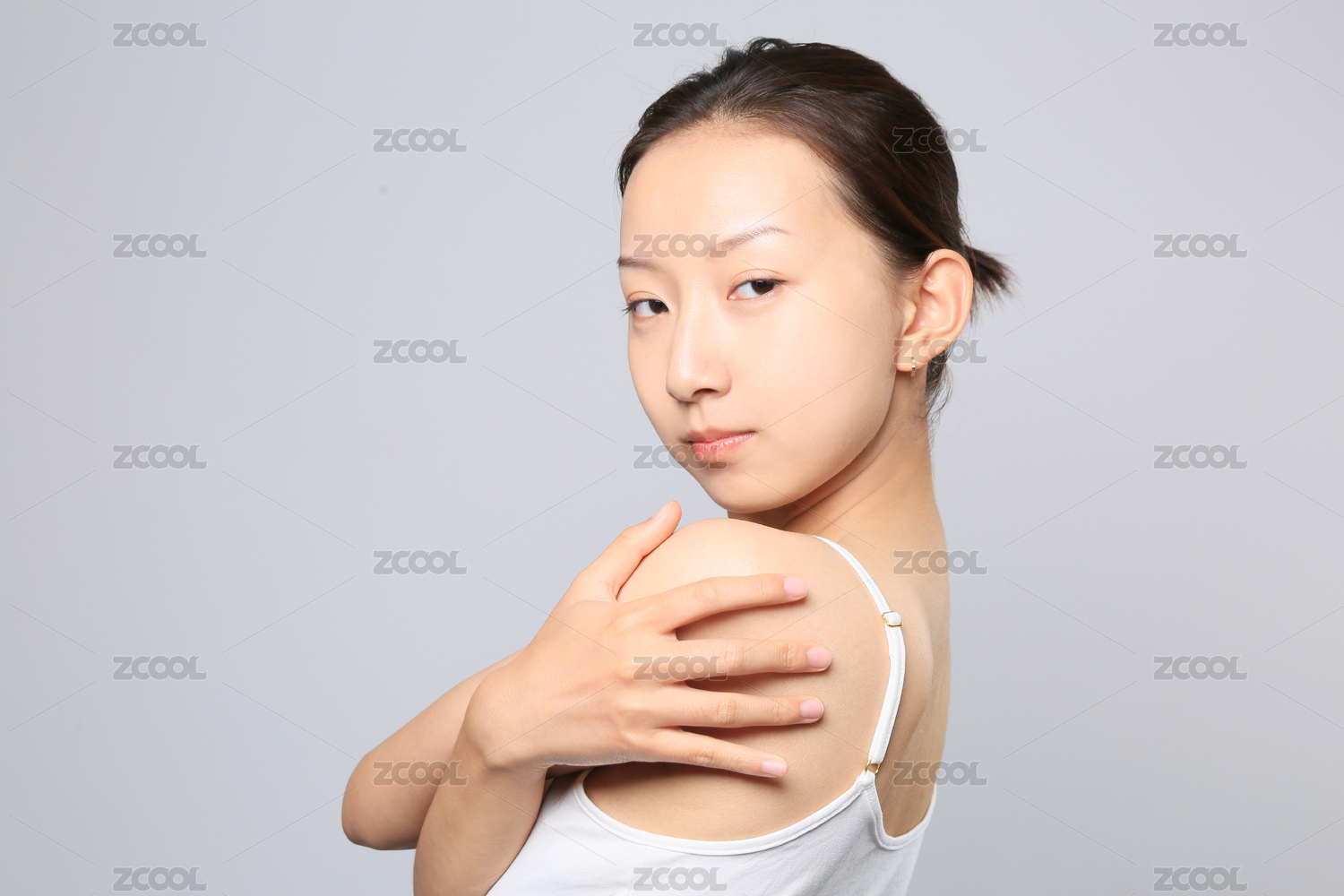 中国女性护肤美妆 双手环绕头部眼神看向别处