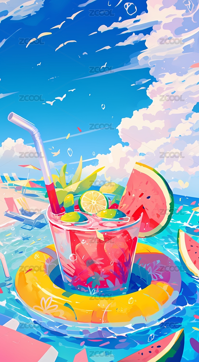 套着游泳圈漂浮在水面上的夏日冷饮,创意插
