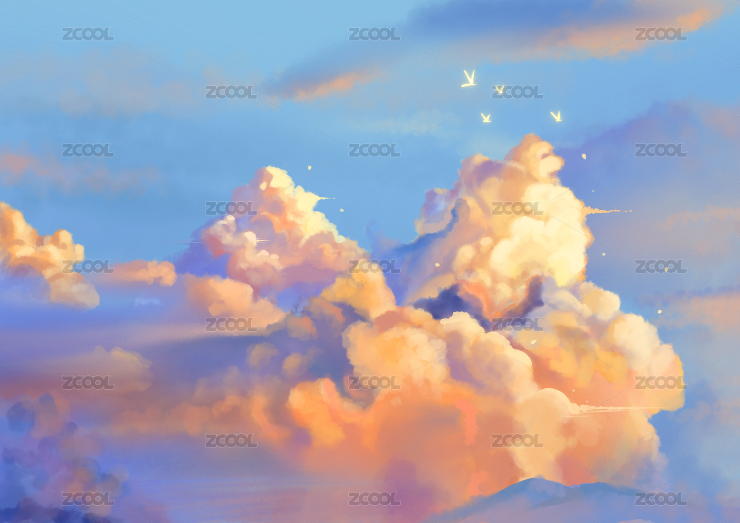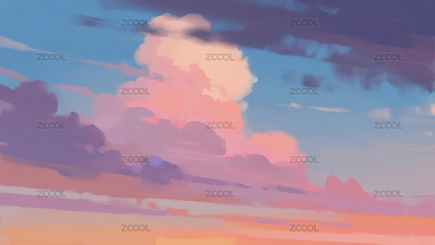 手绘梦幻治愈系蓝色天空云朵晚霞插图背景