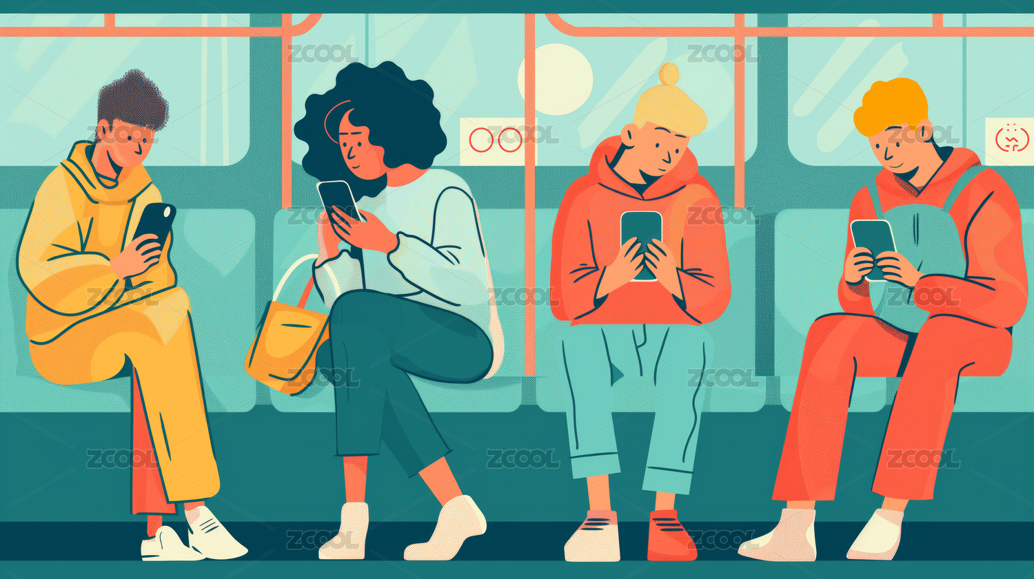 地铁上低头看手机的人物插画