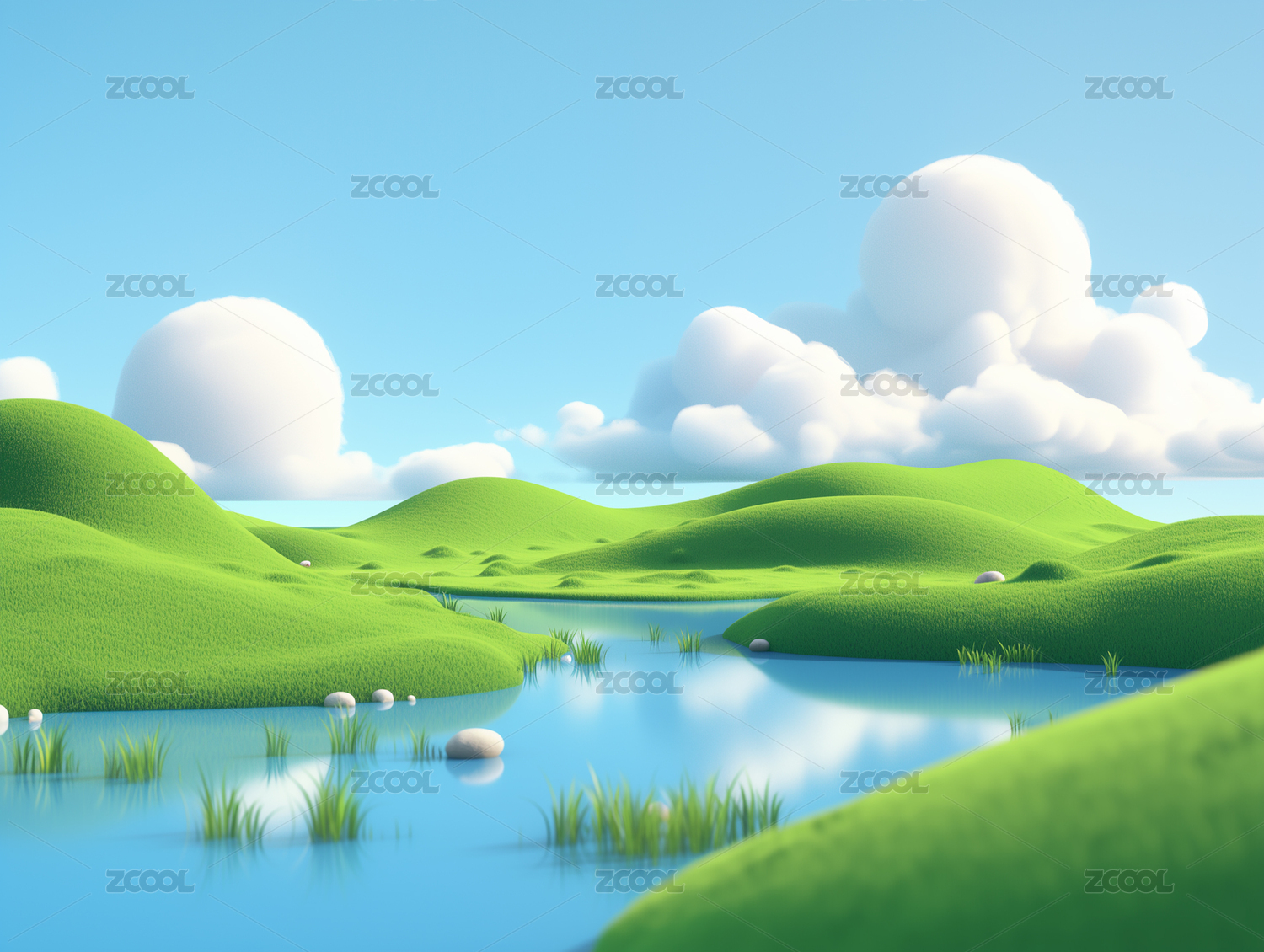 绿色的大堤中间蜿蜒的河流风景3D卡通插画