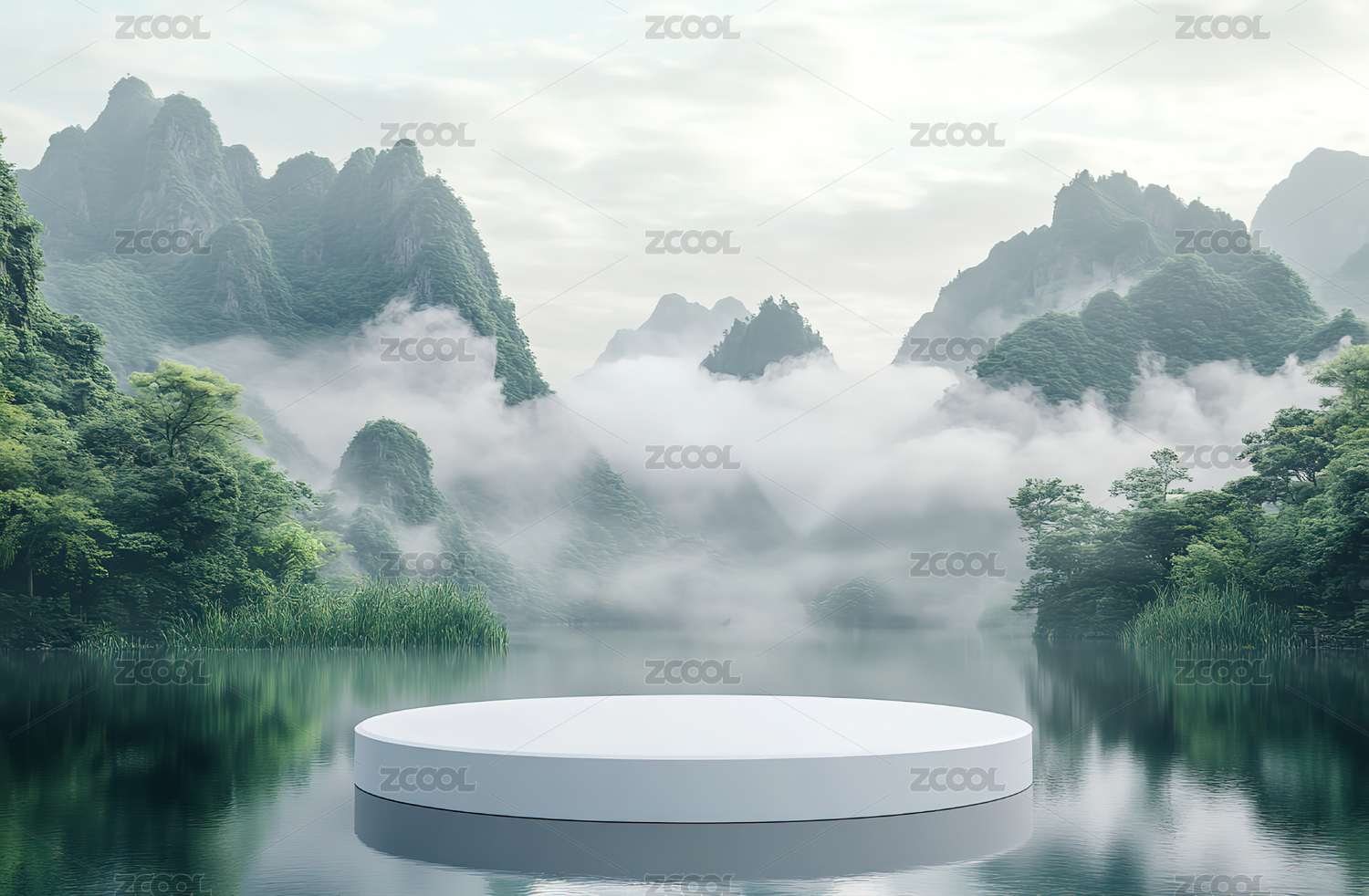 3D新中式青山和松树风景白色圆形产品展台