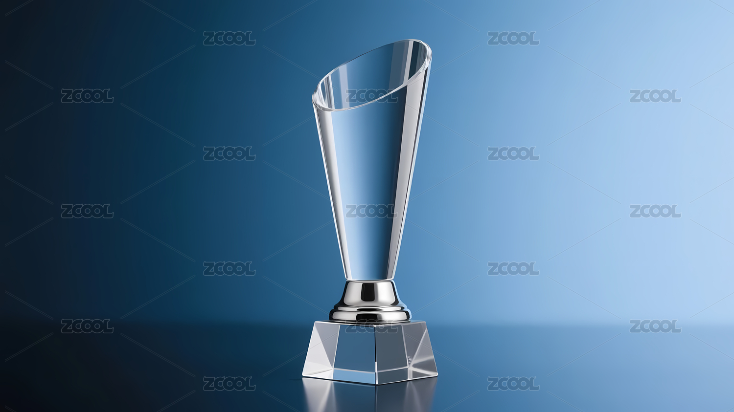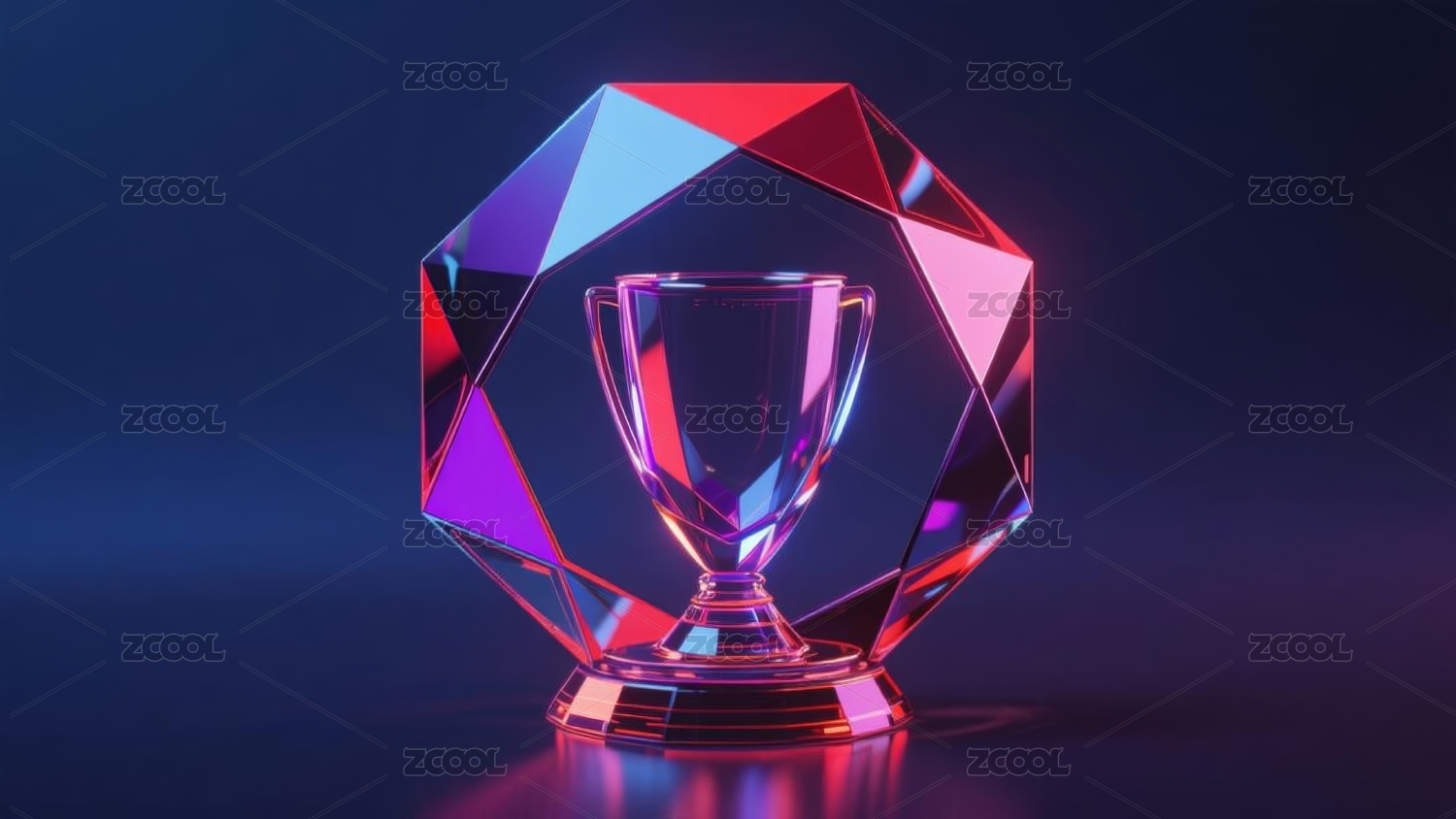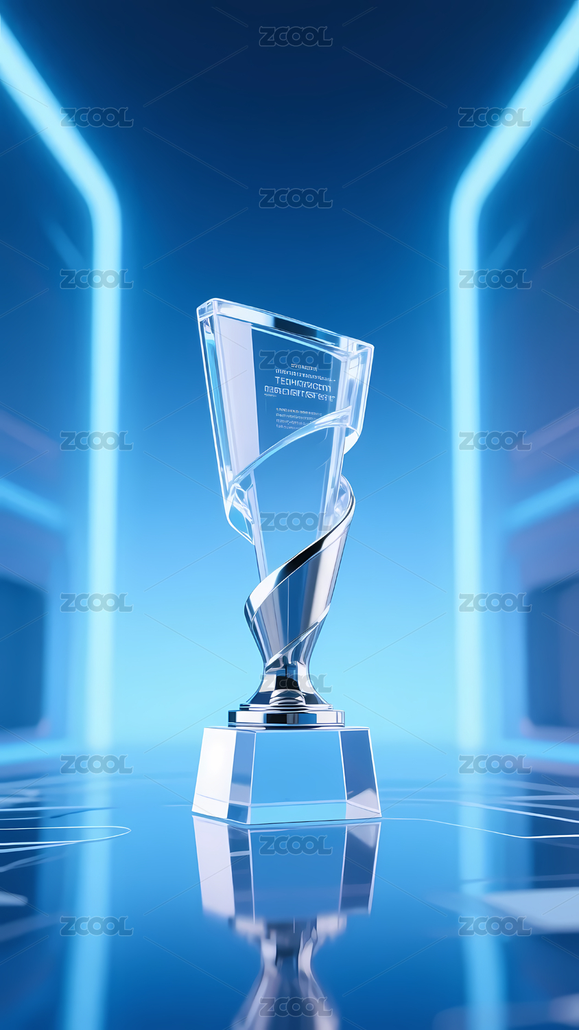 水晶奖杯在蓝色科技光影中展现未来荣誉