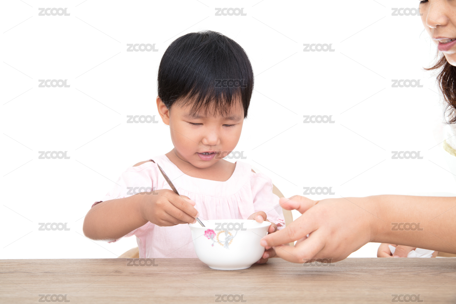 白背景前妈妈在给女儿喂饭