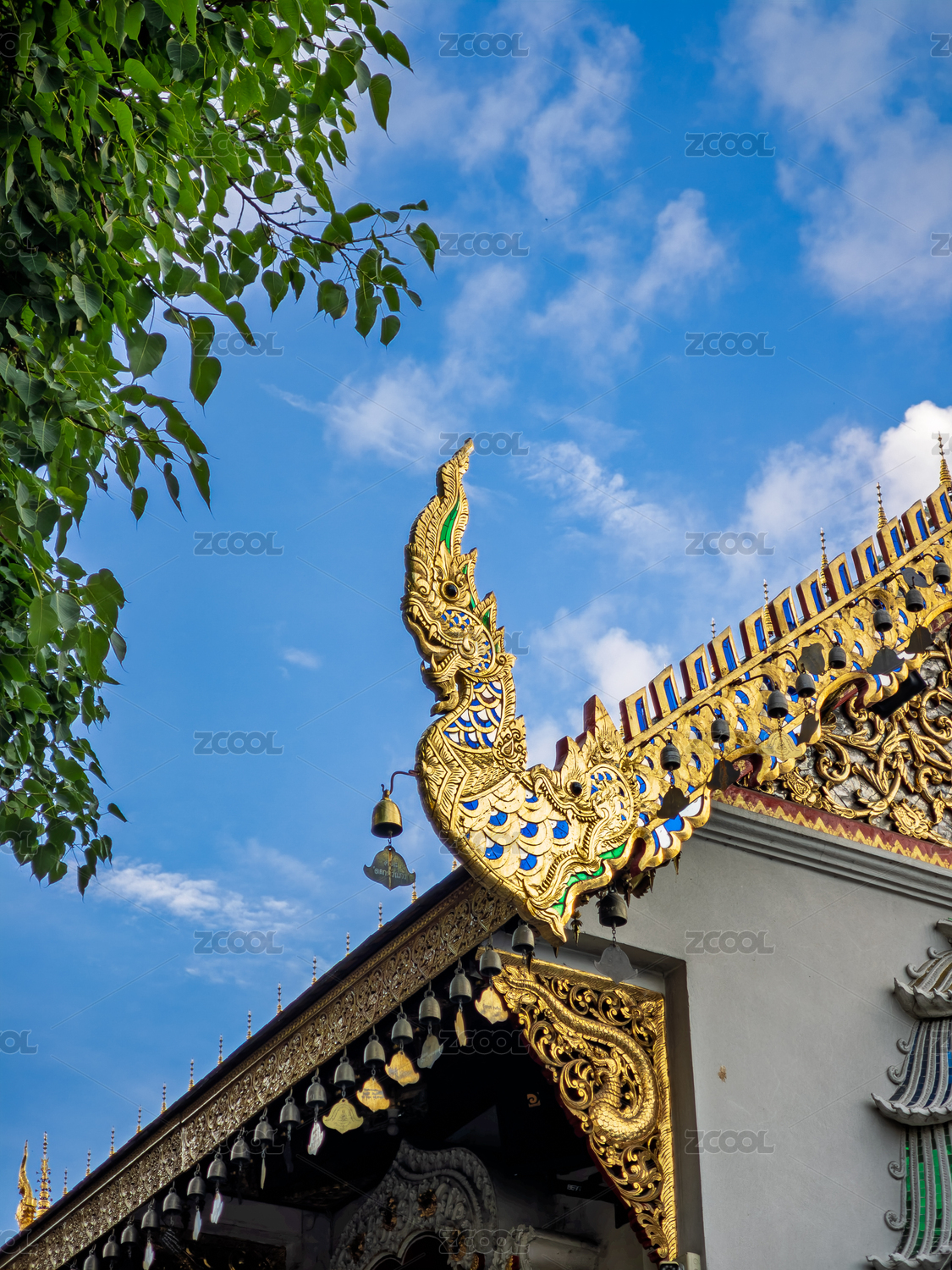 泰国兰纳风格寺庙屋顶的金色那伽雕塑