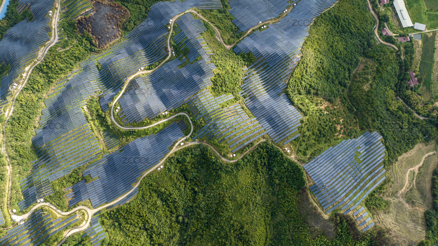 航拍山上的太阳能光伏板