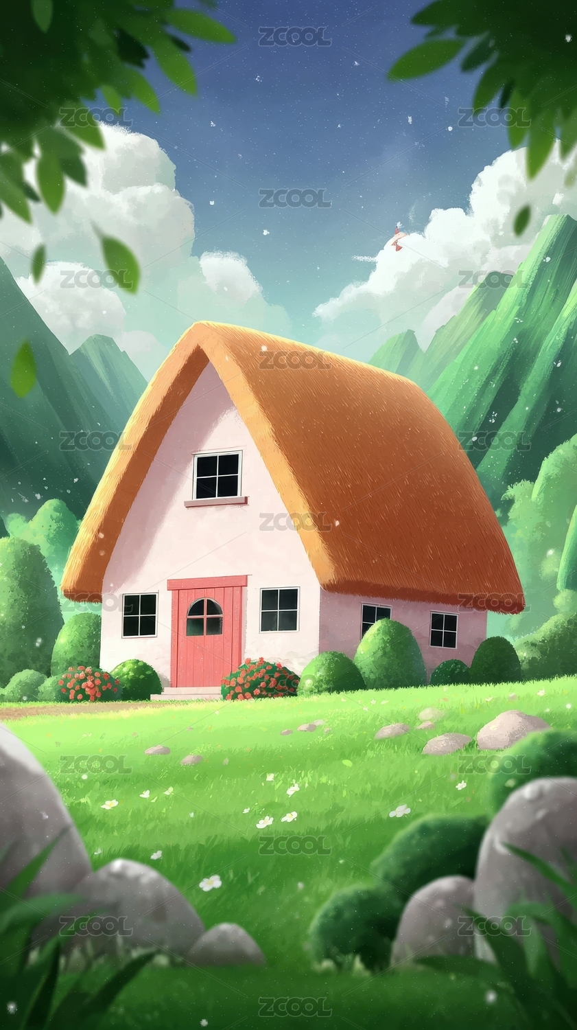 卡通小屋与阳光明媚的风景