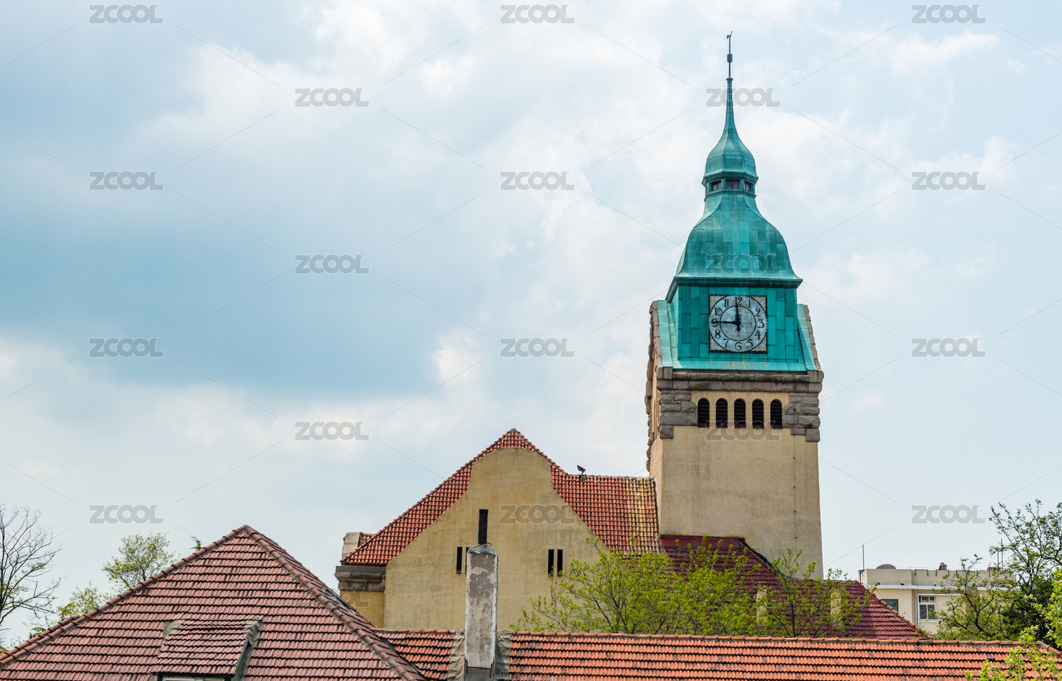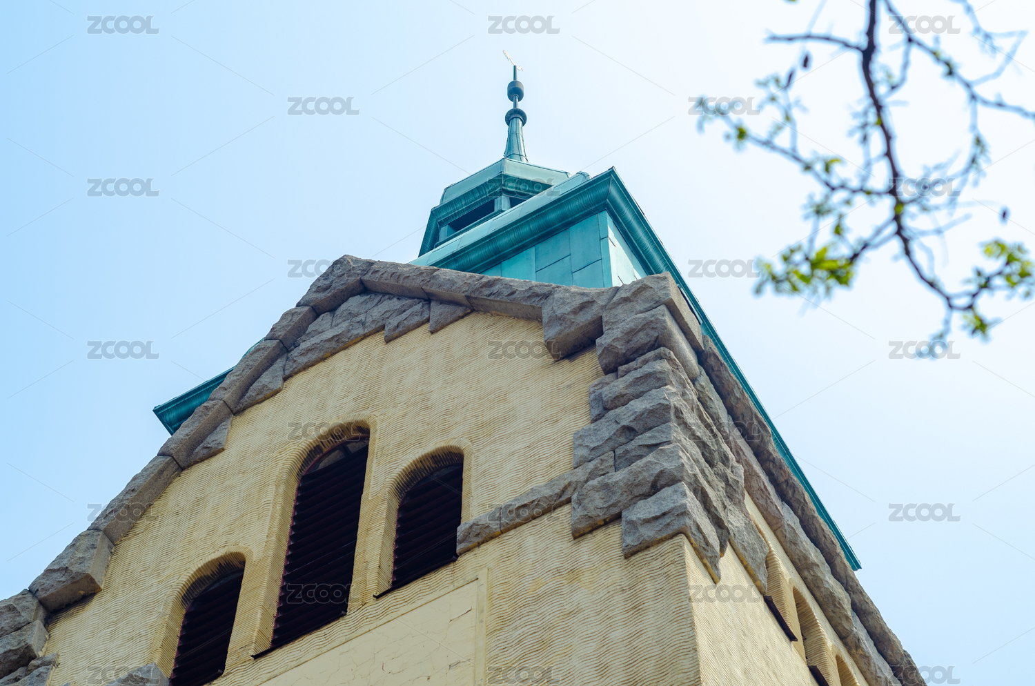 山东省青岛市市南区江苏路基督教堂钟楼仰拍欧式建筑