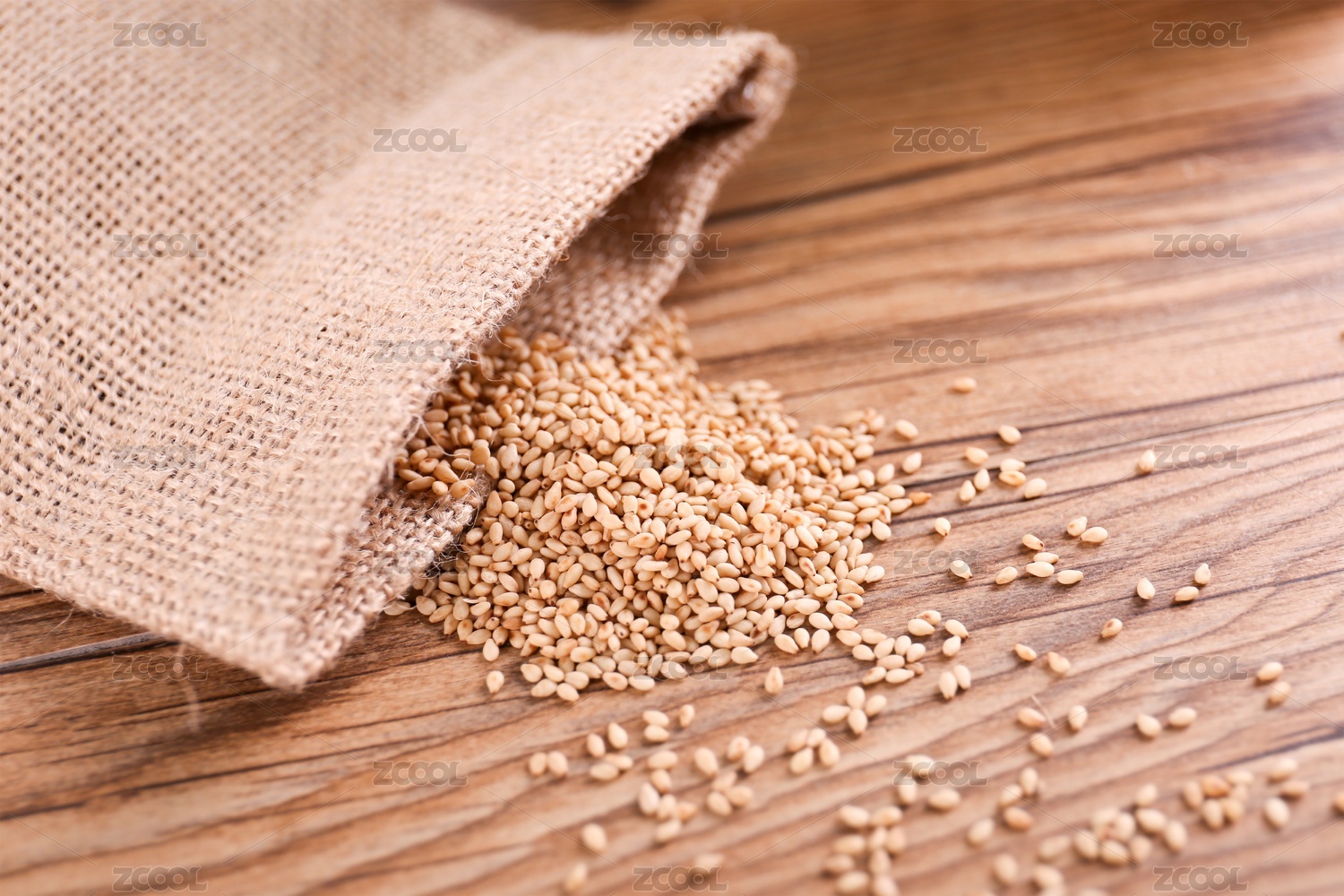 放在木纹背景上从麻布袋里倒出来的白芝麻