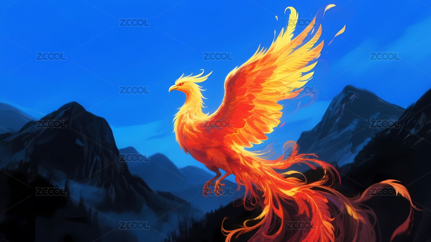 凤凰,飞鸟,神鸟,奇幻,山峰,风景,神话,橙色,金色,翅膀