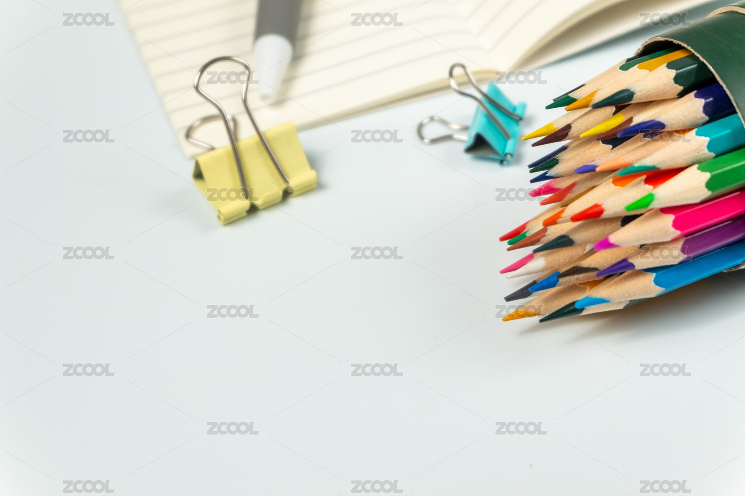拍成上升曲线的彩色铅笔和白色的纸张背景