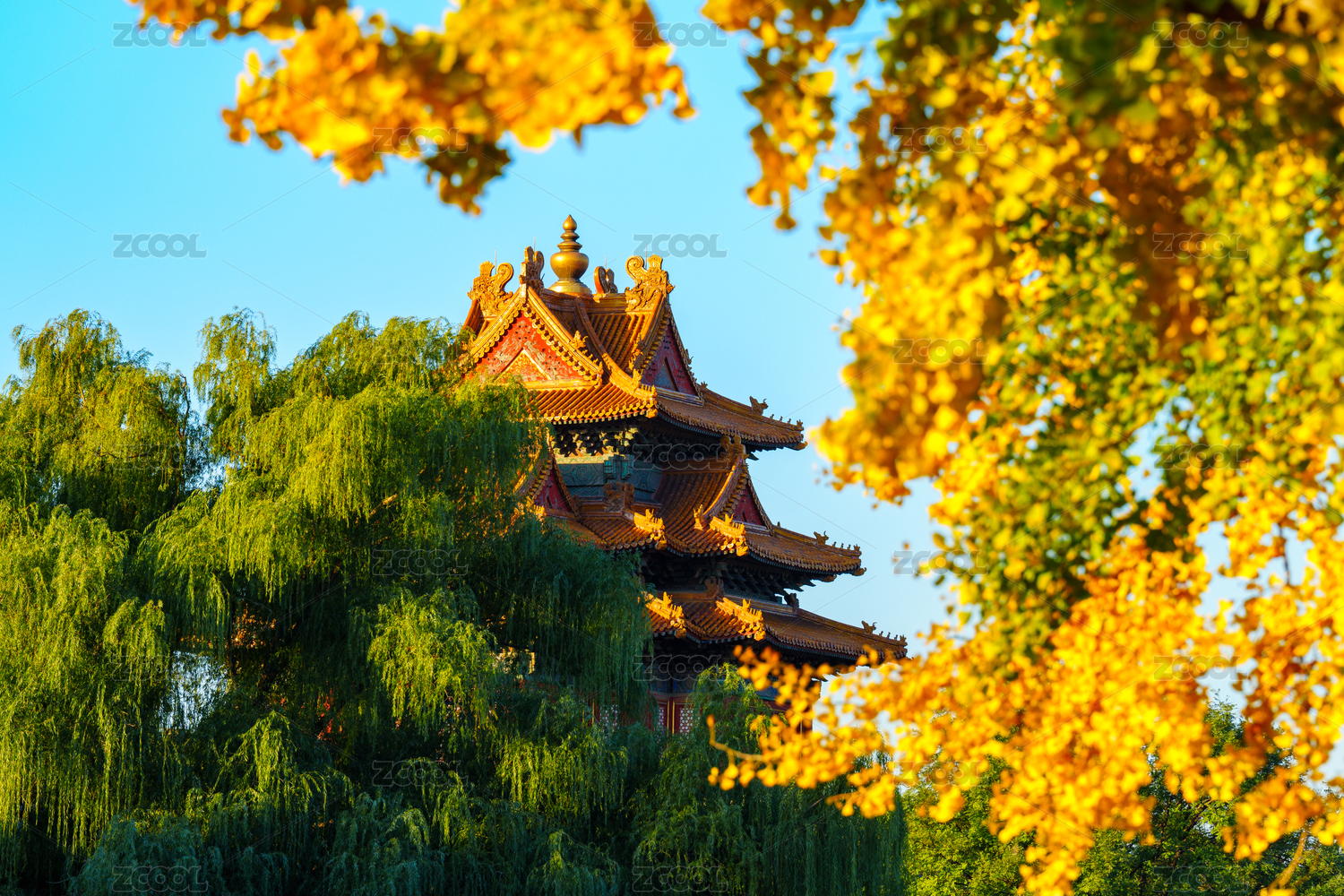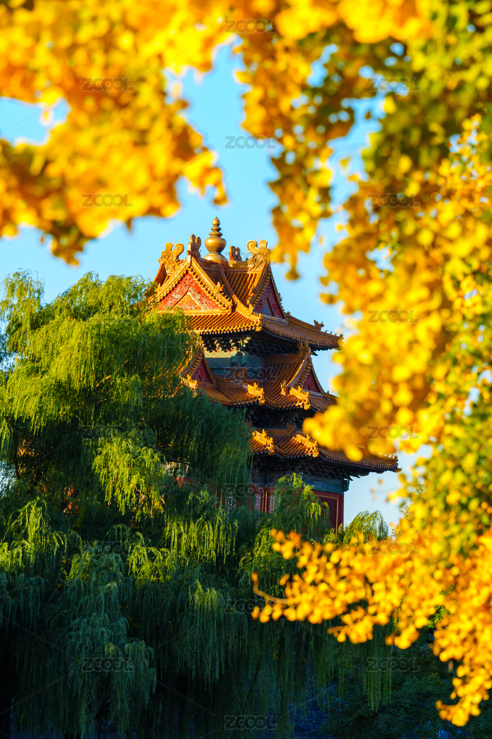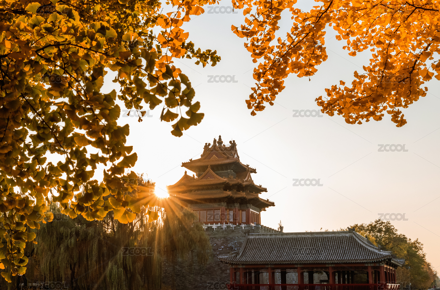 秋日阳光中金色银杏树叶掩映下的故宫角楼