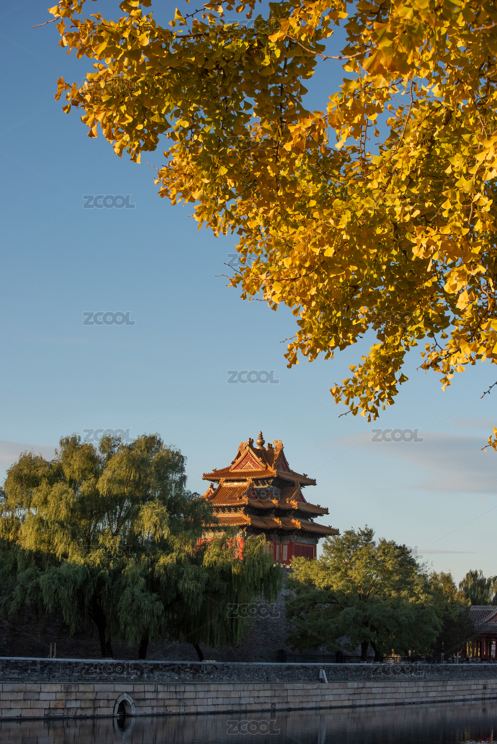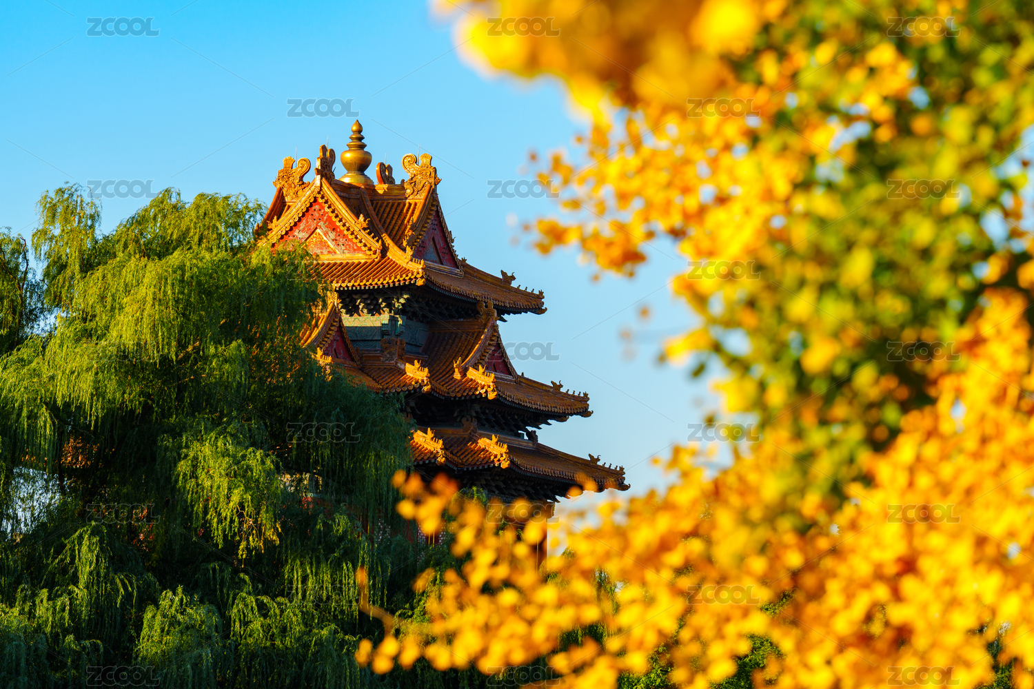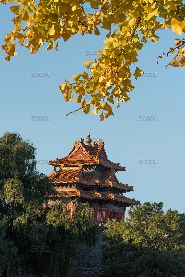 秋日阳光中金色银杏树叶掩映下的故宫角楼