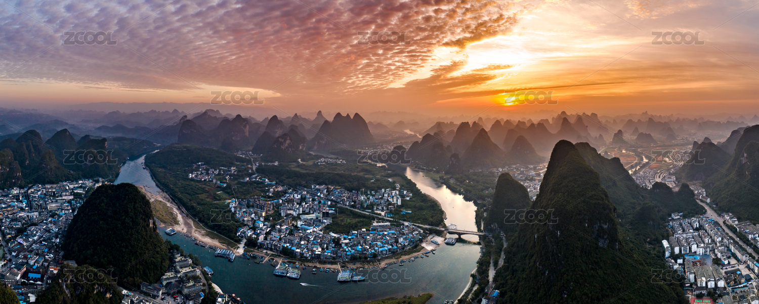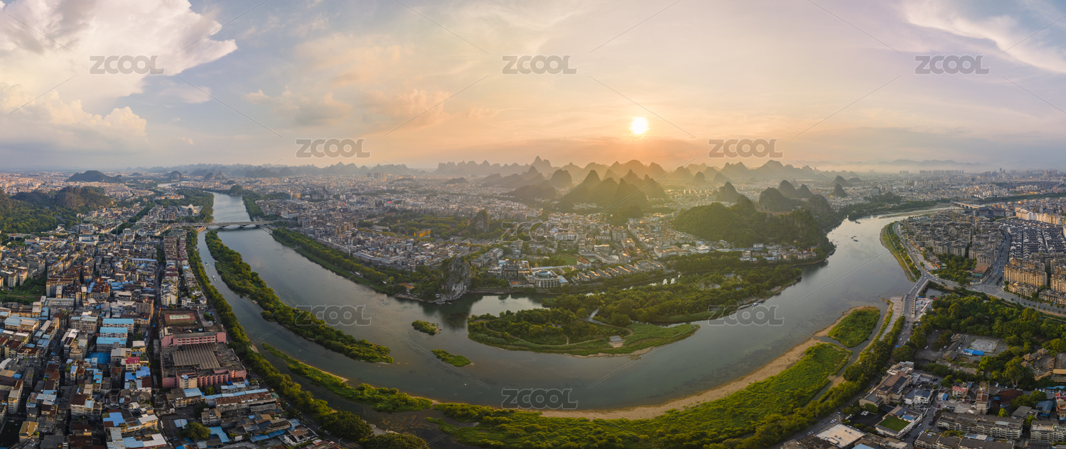 桂林漓江沿岸城市风景自然风光日落晚霞航拍