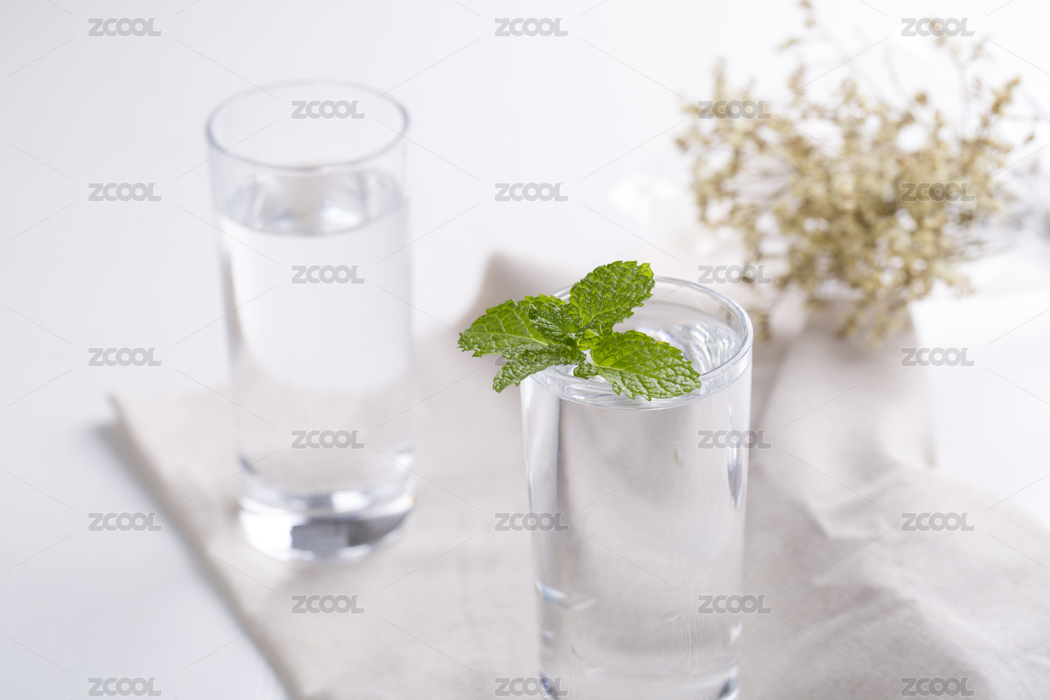 白色桌子上的水杯和新鲜的薄荷叶