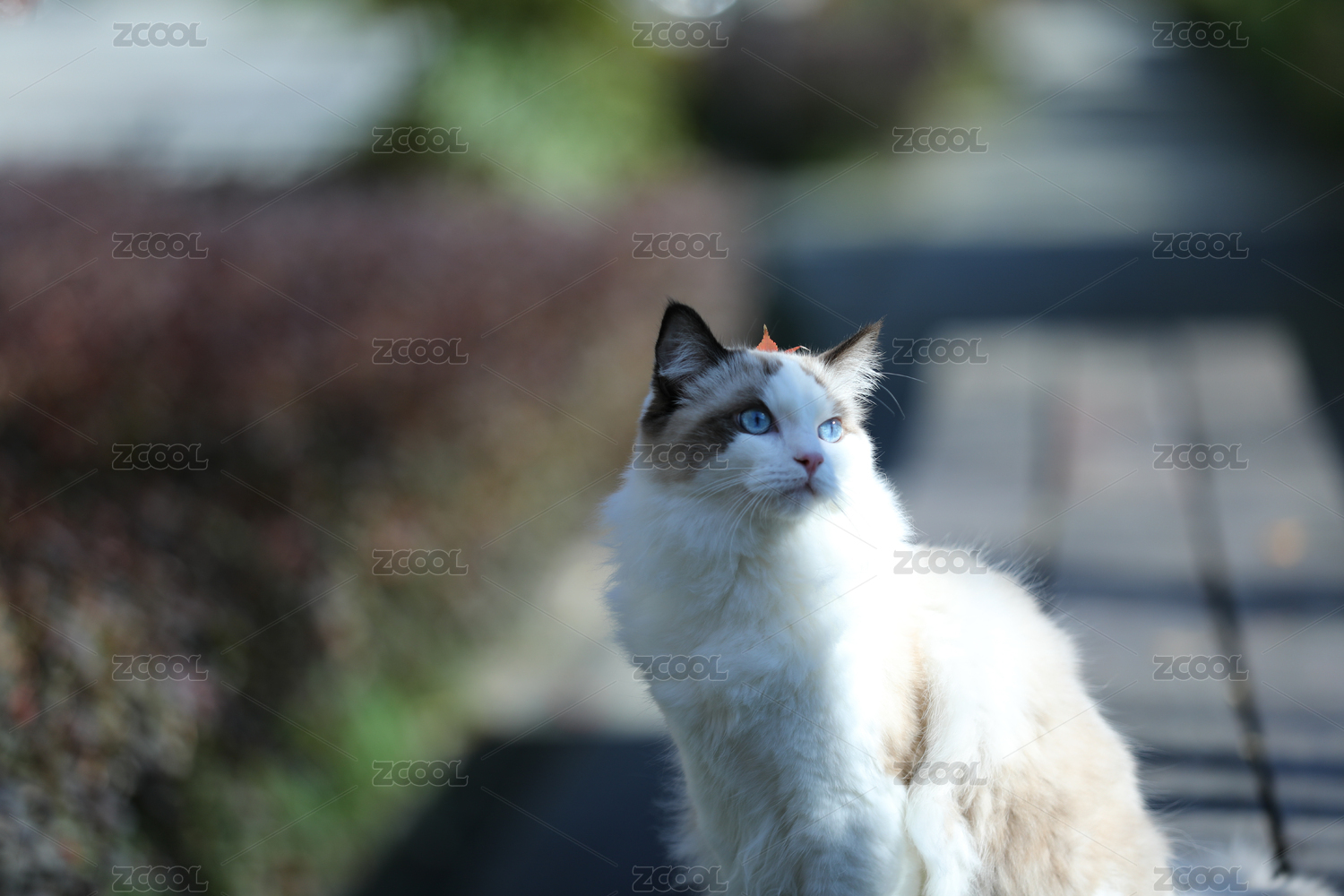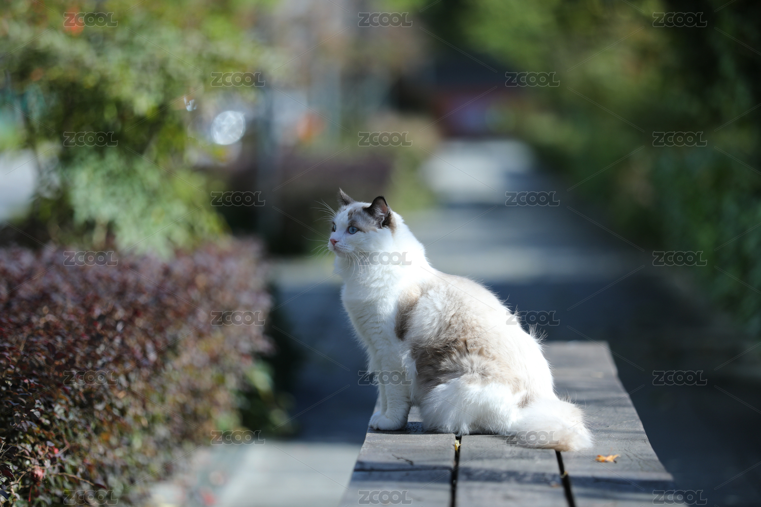布偶猫坐在公园的长椅上