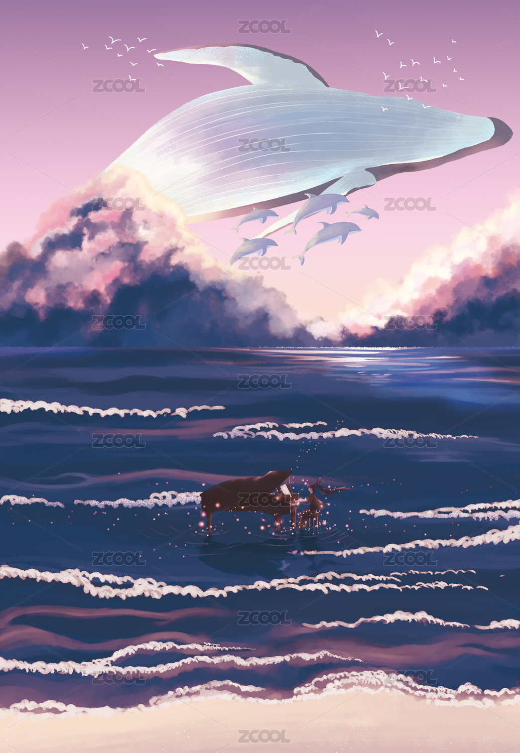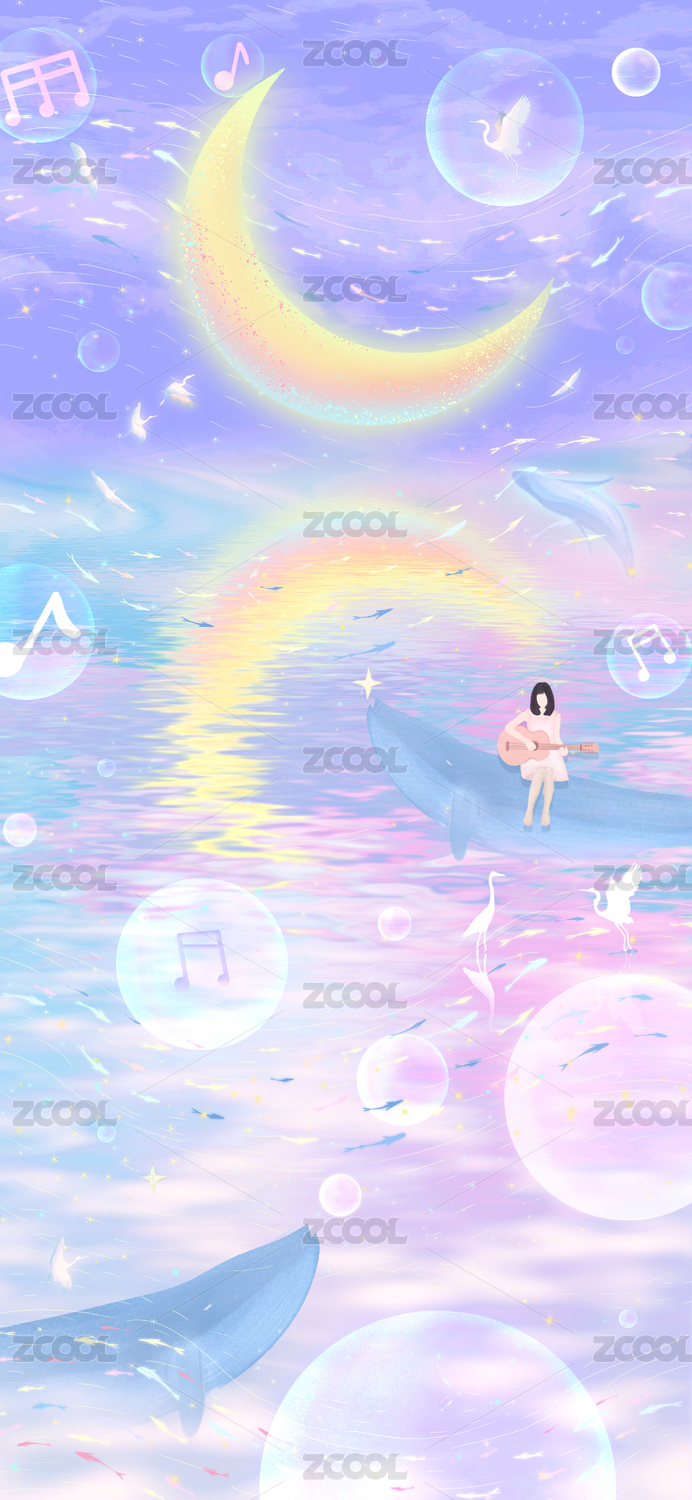 夏天月亮悬浮在夜空中,少女坐在大海中的蓝鲸背上弹吉他,鱼群伴随着音乐歌声在身侧跳舞超现实插画背景海报