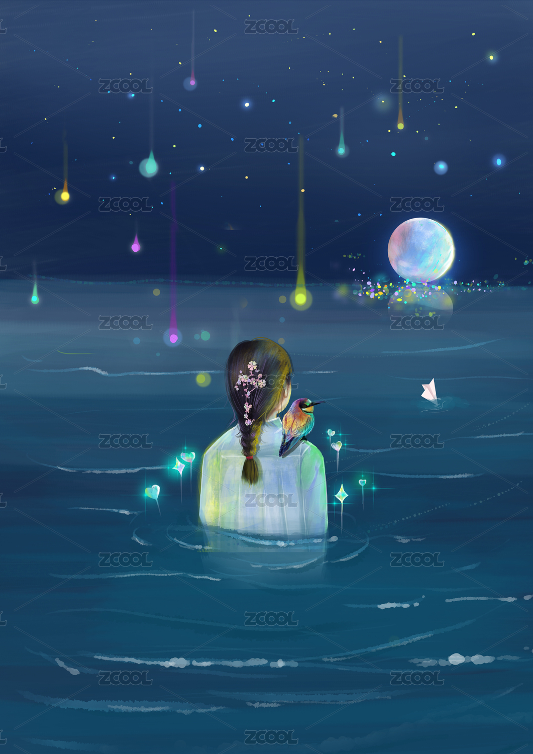 站在水中眺望远方月亮的女孩插图