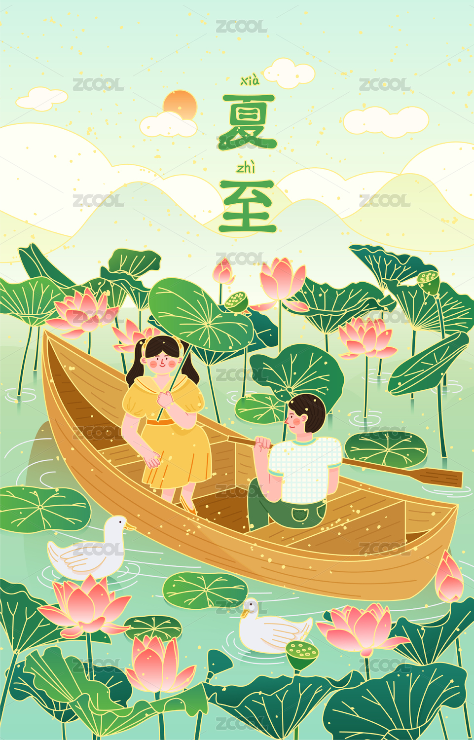 夏天夏至二十四节气男孩女孩在荷花池摘荷花
