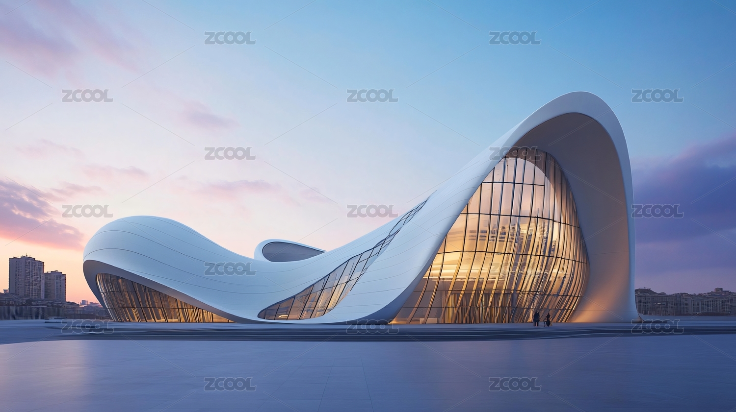 波浪形现代建筑与宁静水面