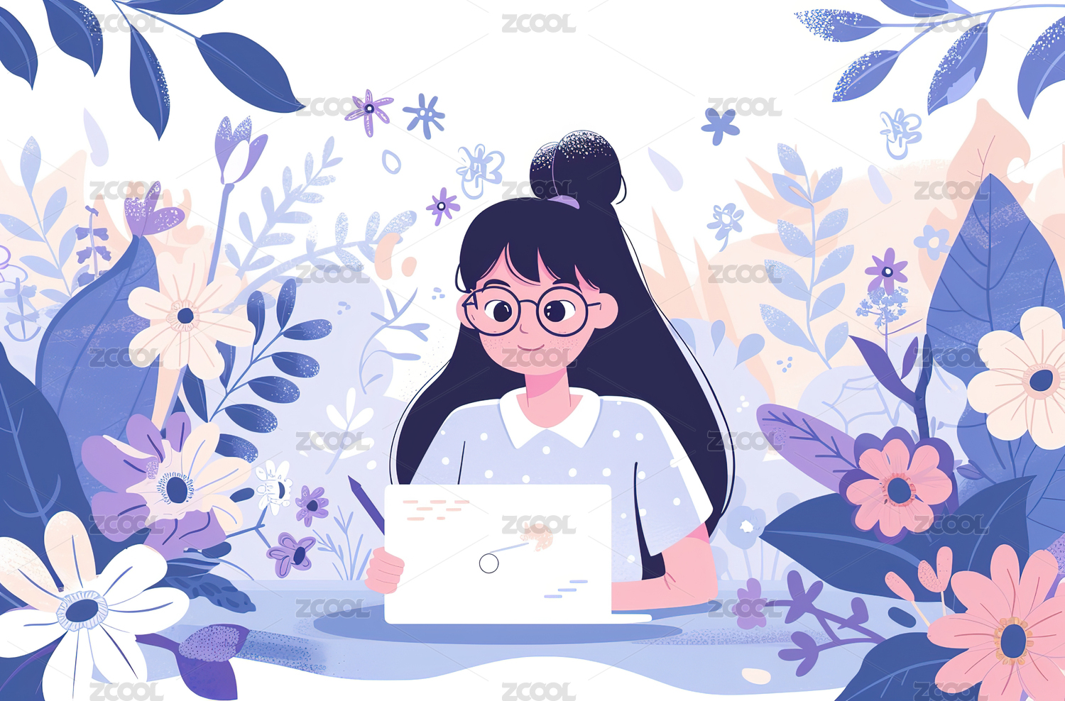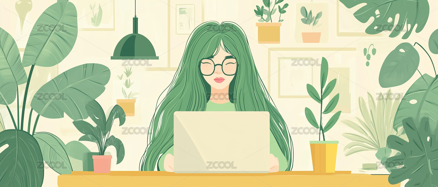 女孩在植物丛中办公工作插画