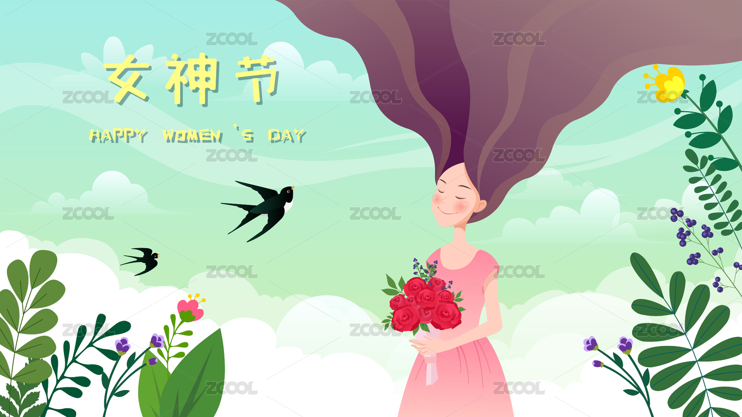 妇女节,女神节,女生,女士,女神,花朵,玫瑰,花束,矢量,扁平
