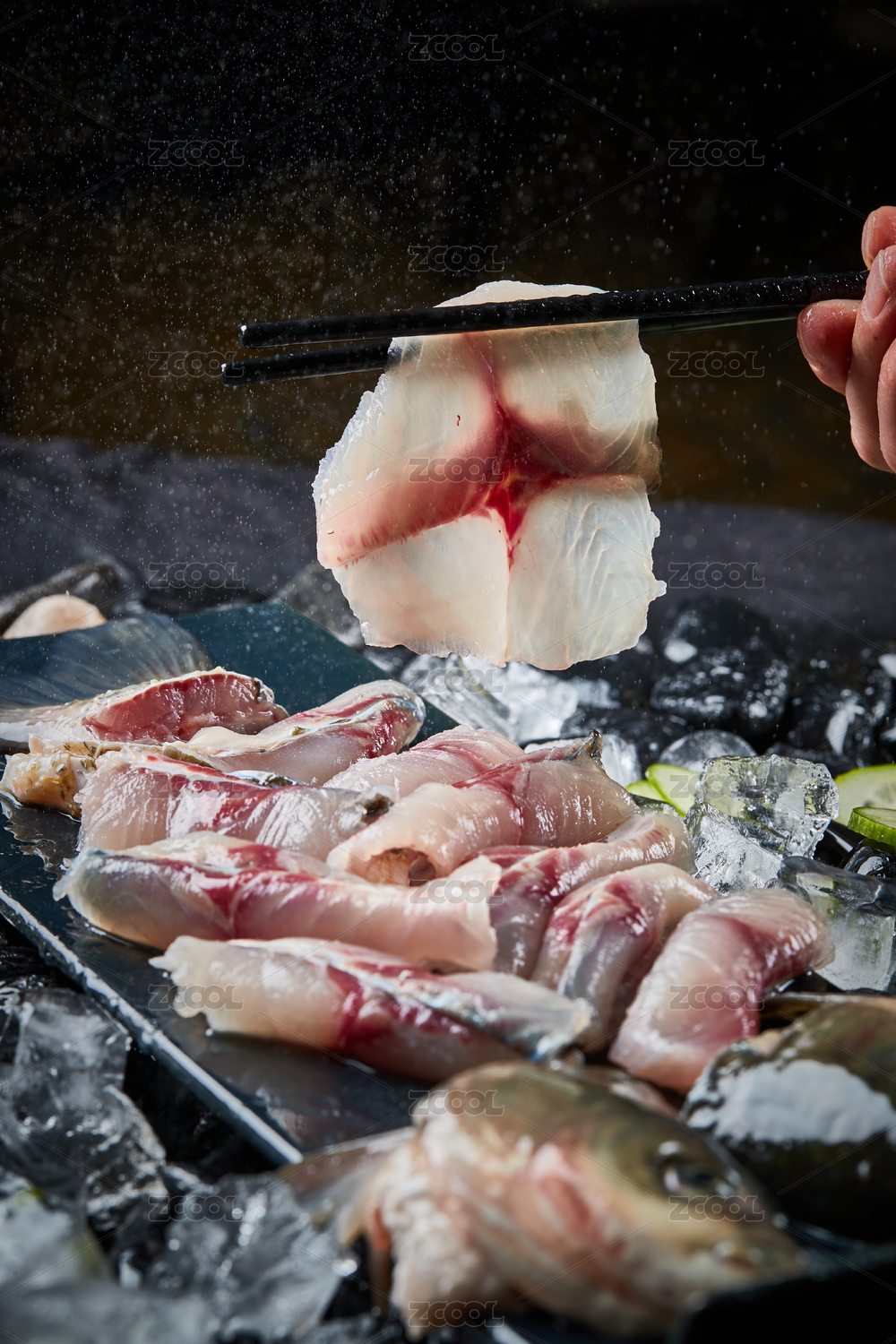 筷子夹起一片火锅食材生鱼片特写