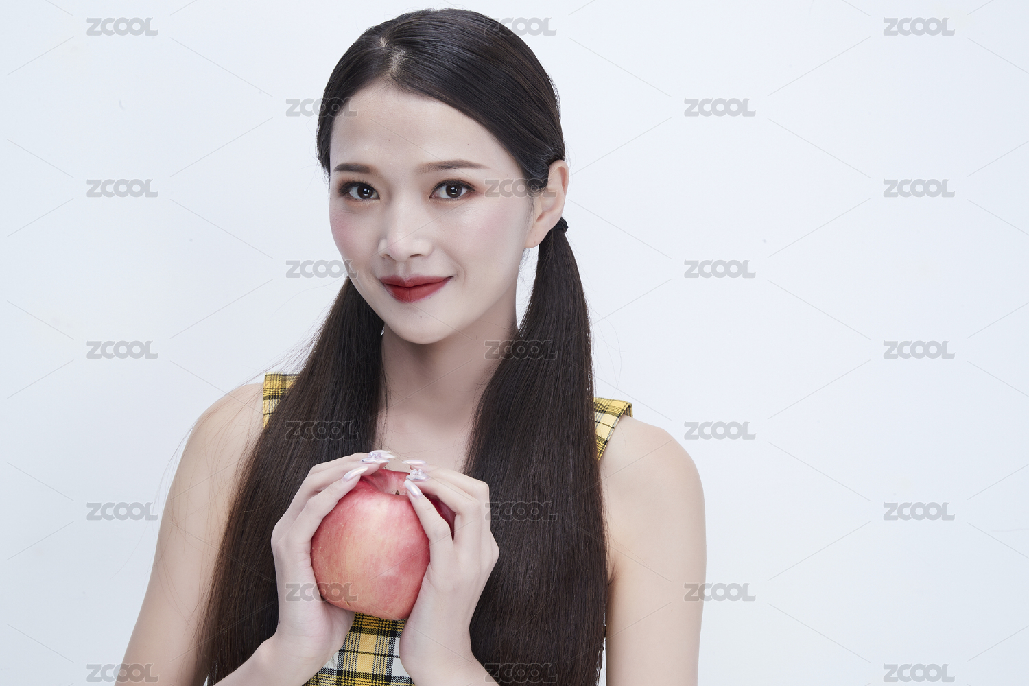 手拿苹果身穿格子吊带裙的亚洲可爱少女人像