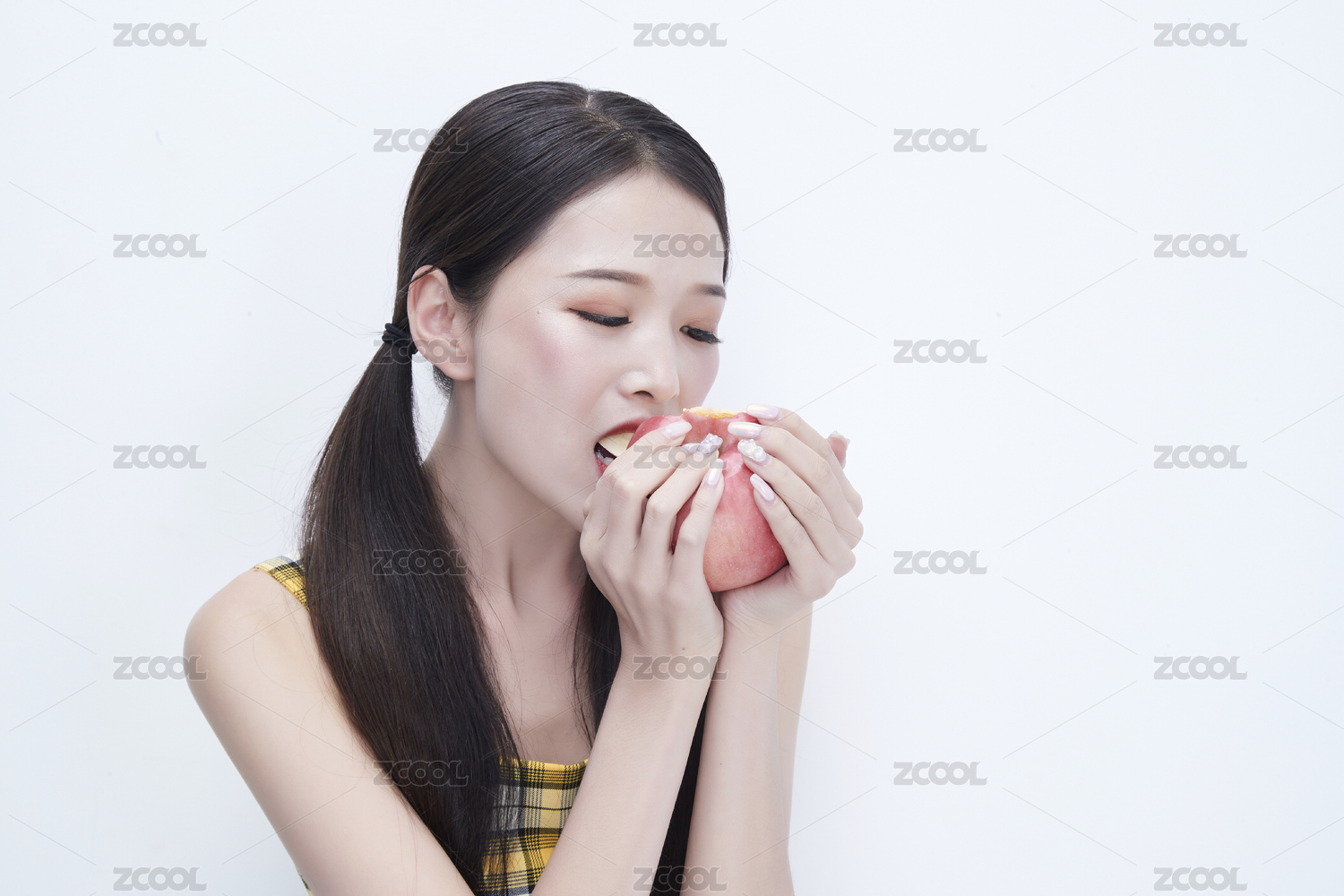 啃咬苹果身穿格子吊带裙的亚洲可爱少女人像