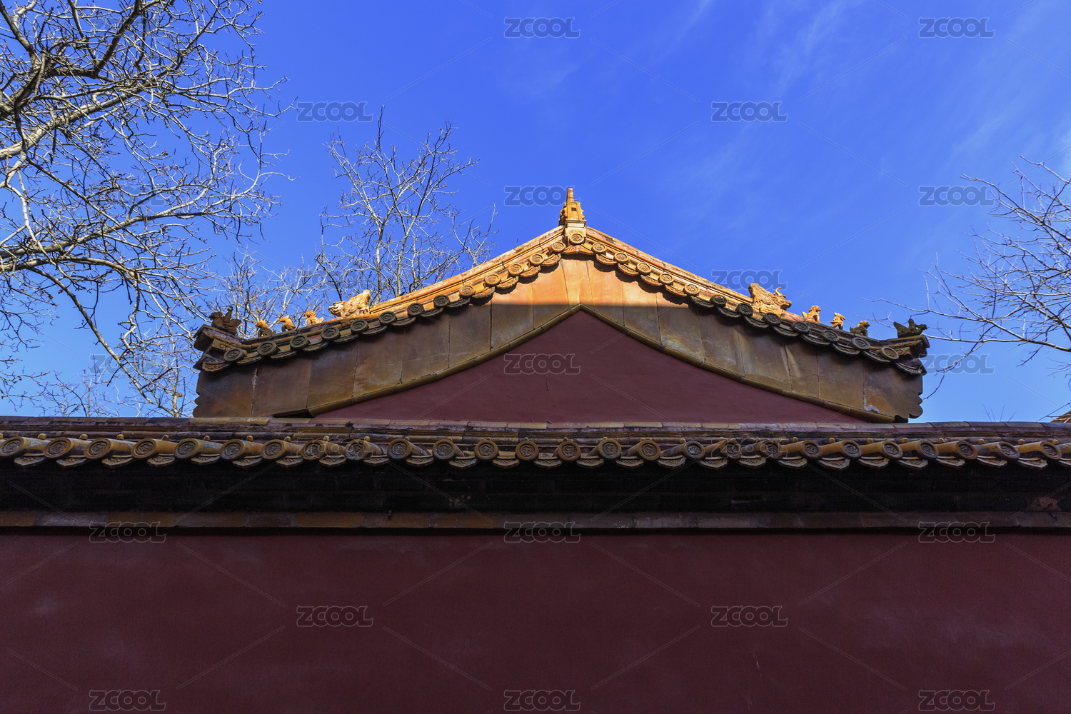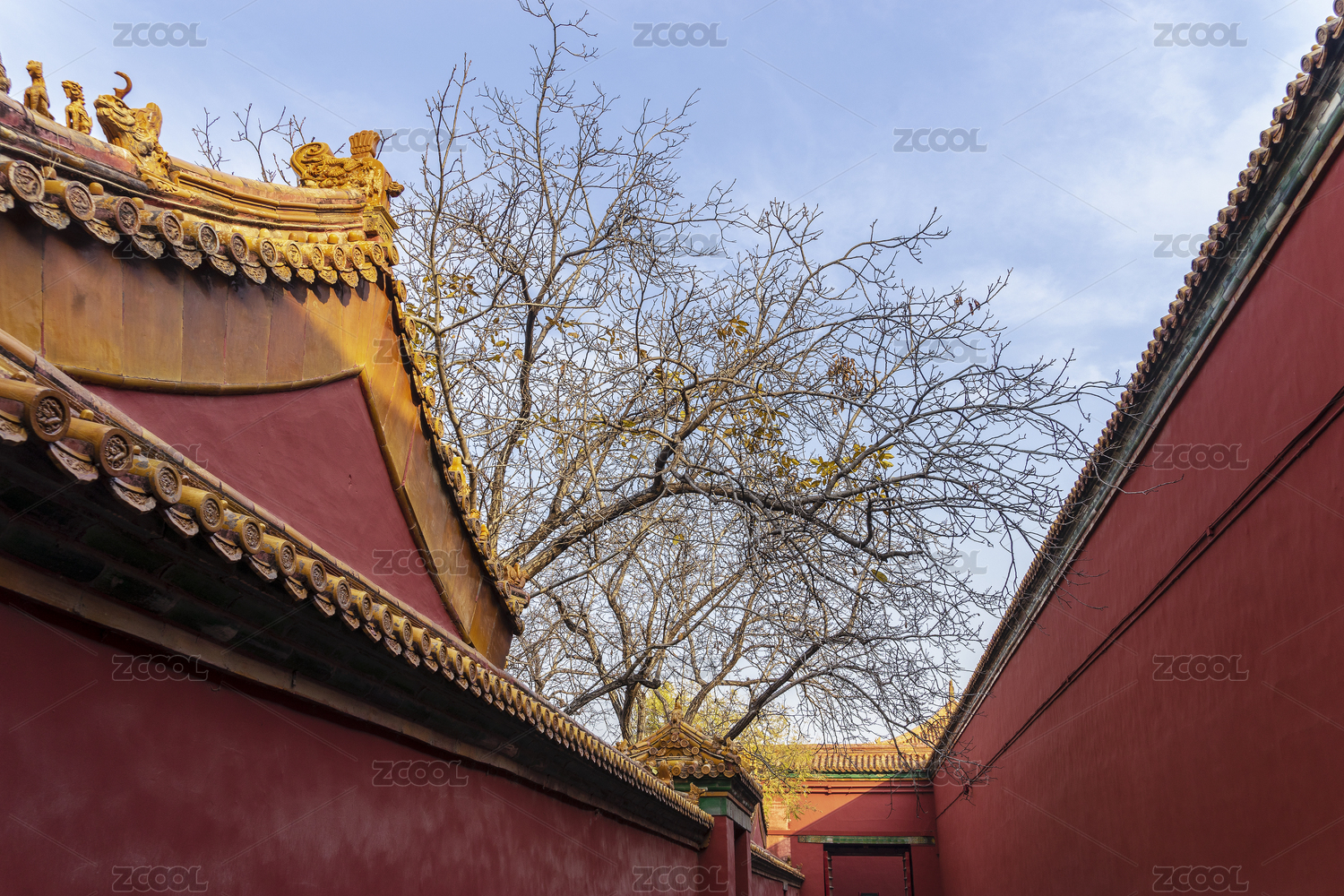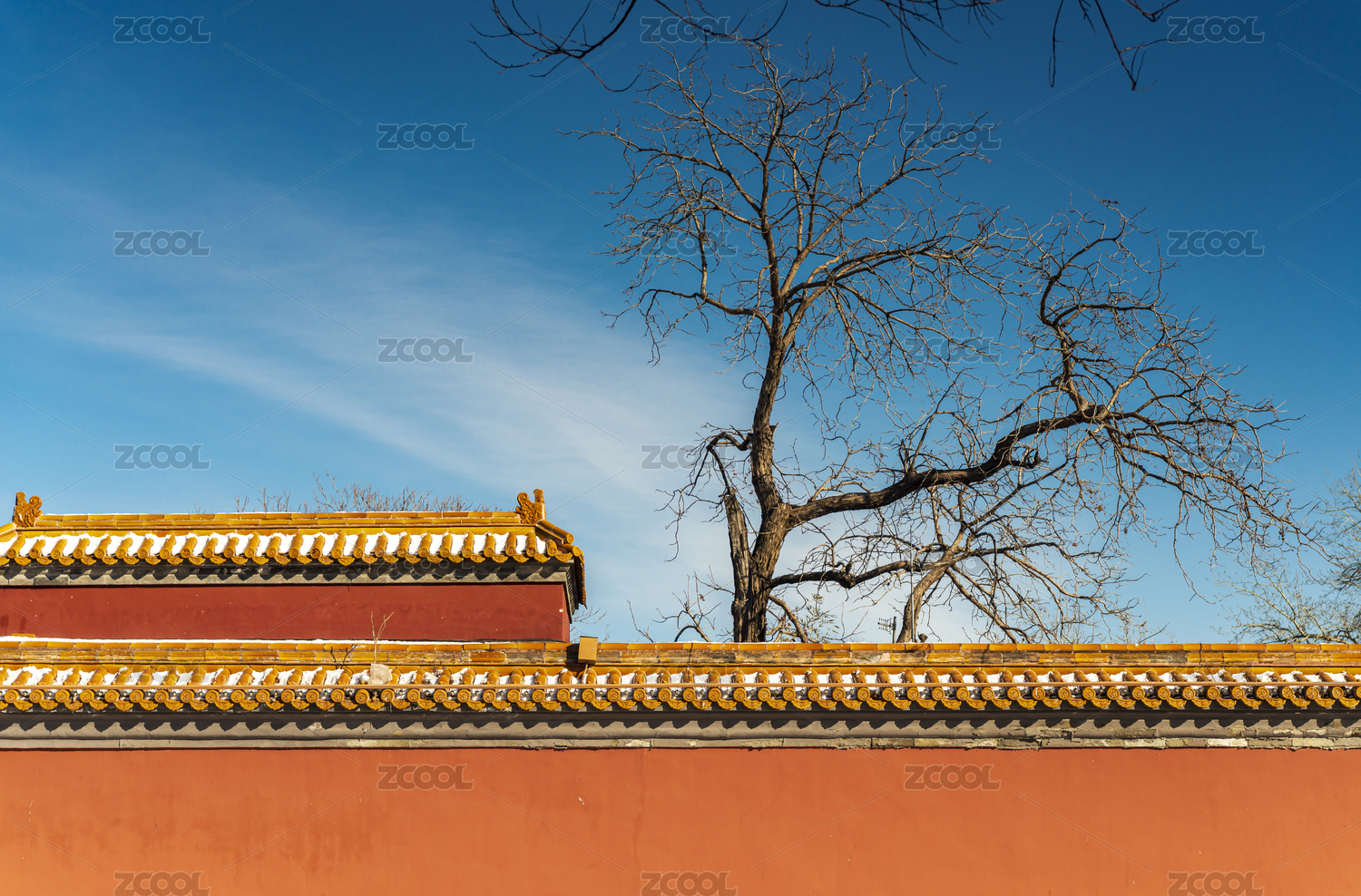 北京故宫秋天红墙枯树琉璃瓦