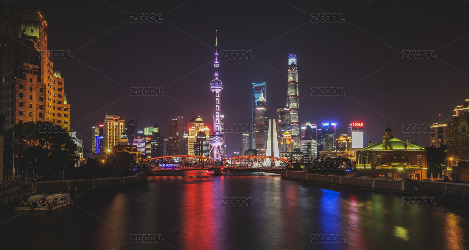 上海的天际线,与黄浦江,晚上在中国上海的标志性建筑。