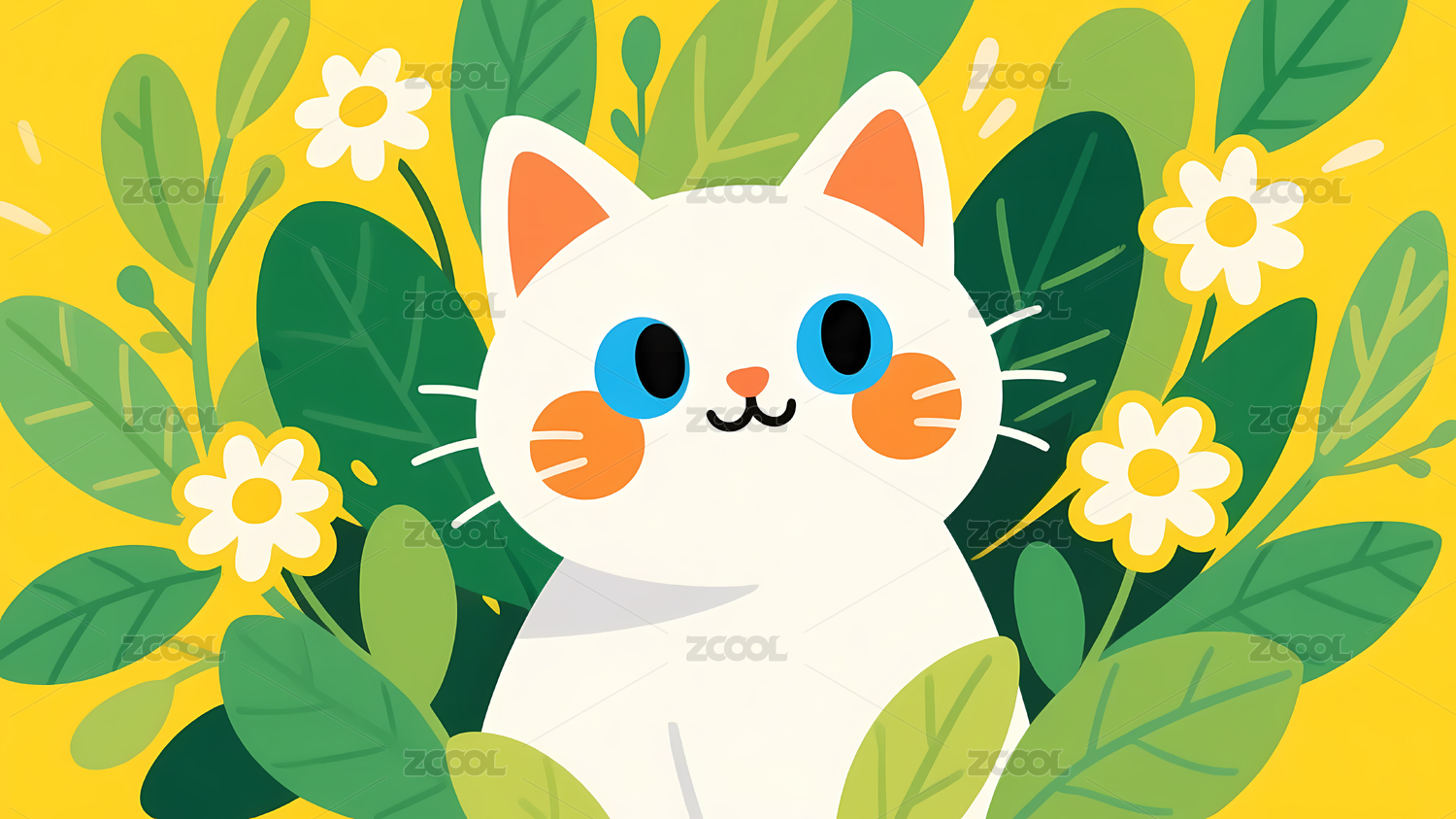 猫,动物,宠物,萌宠,萌趣,治愈系,可爱,白色,树丛,叶子
