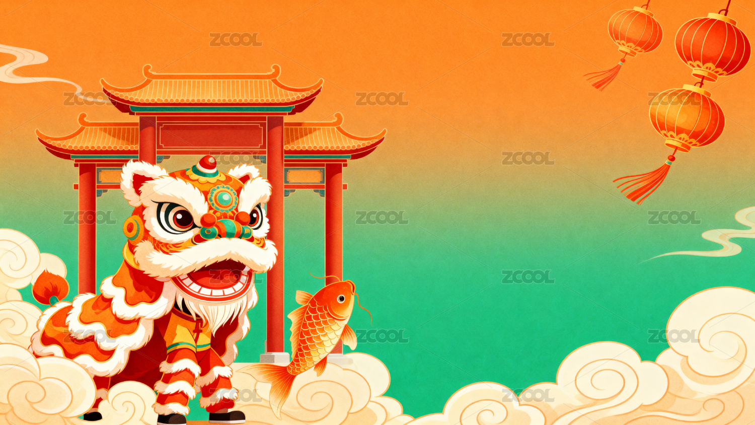 热闹的舞狮与鲤鱼跳跃的新年景象