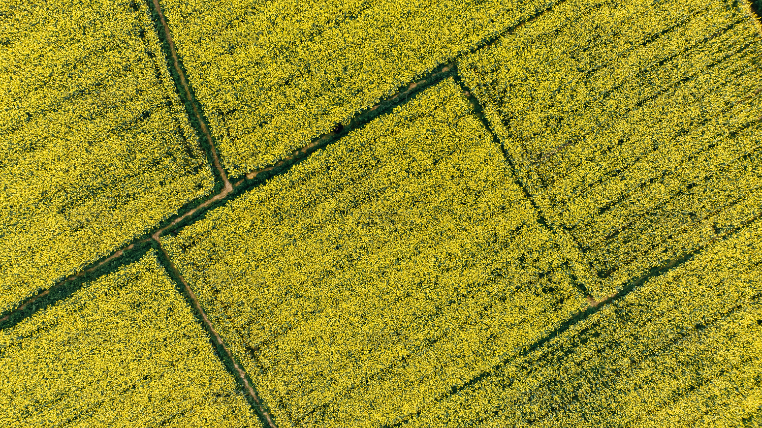 金黄色的油菜花田地正上方航拍
