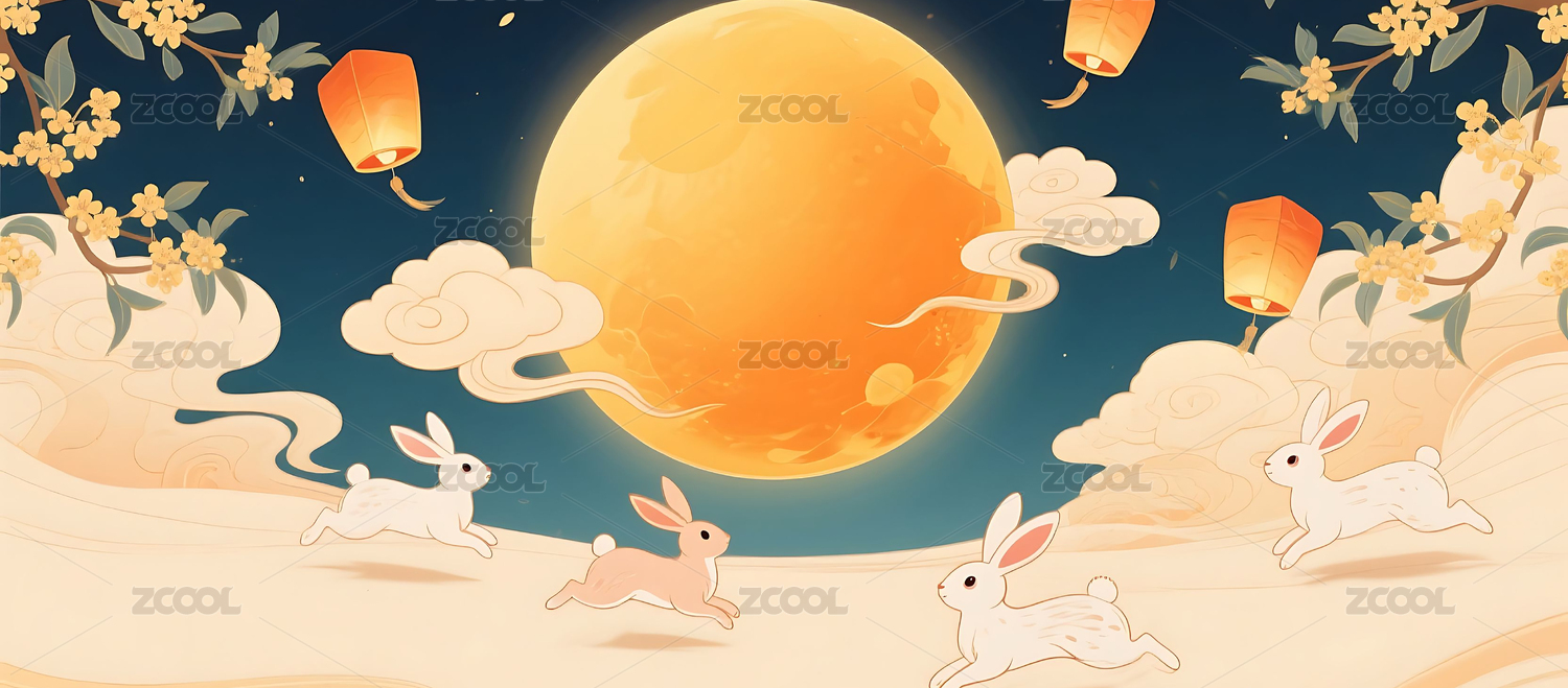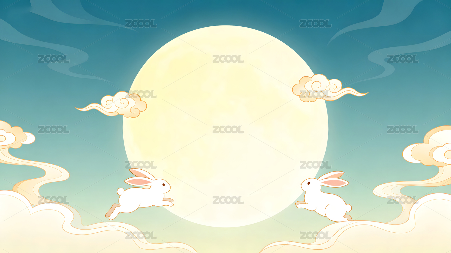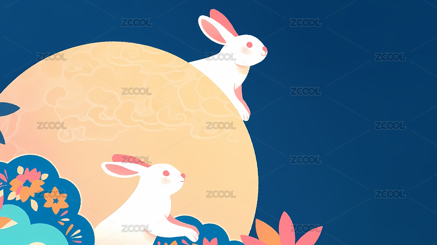 中秋节月亮下奔跑的兔子插画背景壁纸