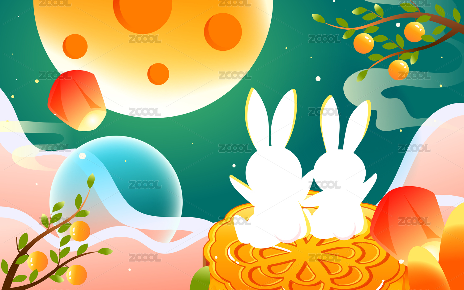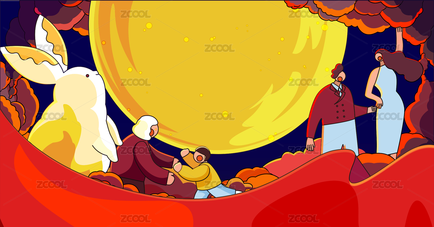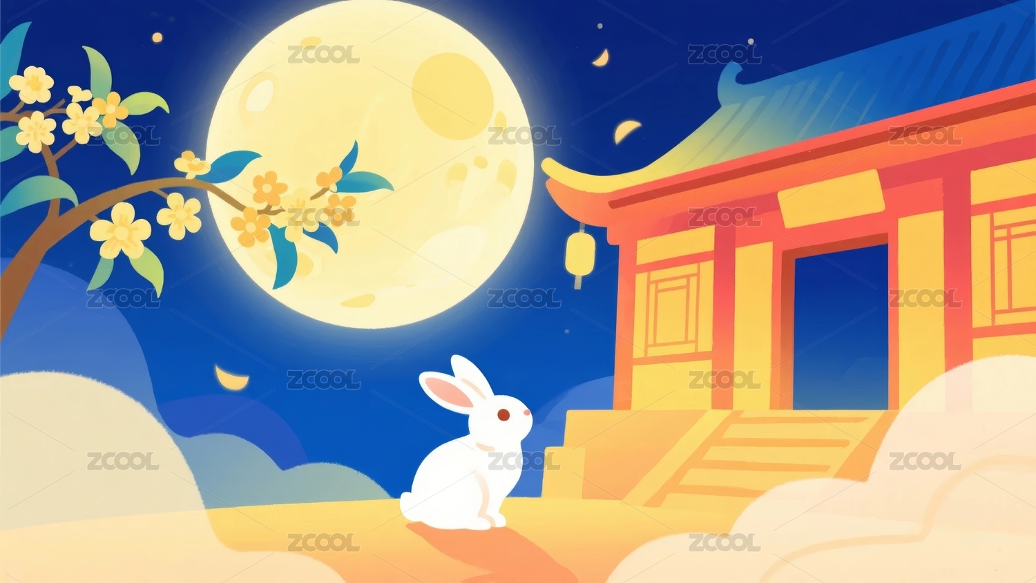 中秋节月亮下奔跑的兔子插画背景壁纸